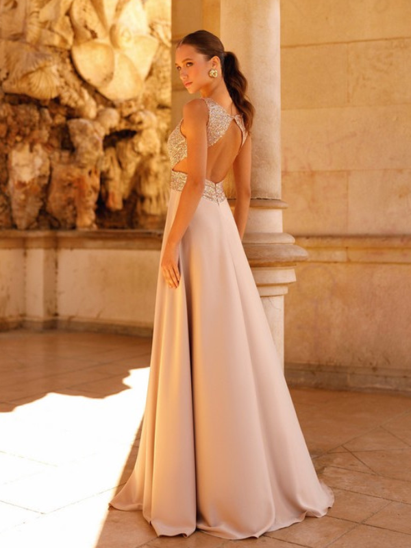 ✨ Détails : Tissu à paillettes, sequins scintillants et broderies lumineuses. Coupe longue et fluide offrant un tombé gracieux ; taille soulignée par un liseré brillant pour structurer la silhouette. Décolleté en V profond pour une touche de sensualité maîtrisée.