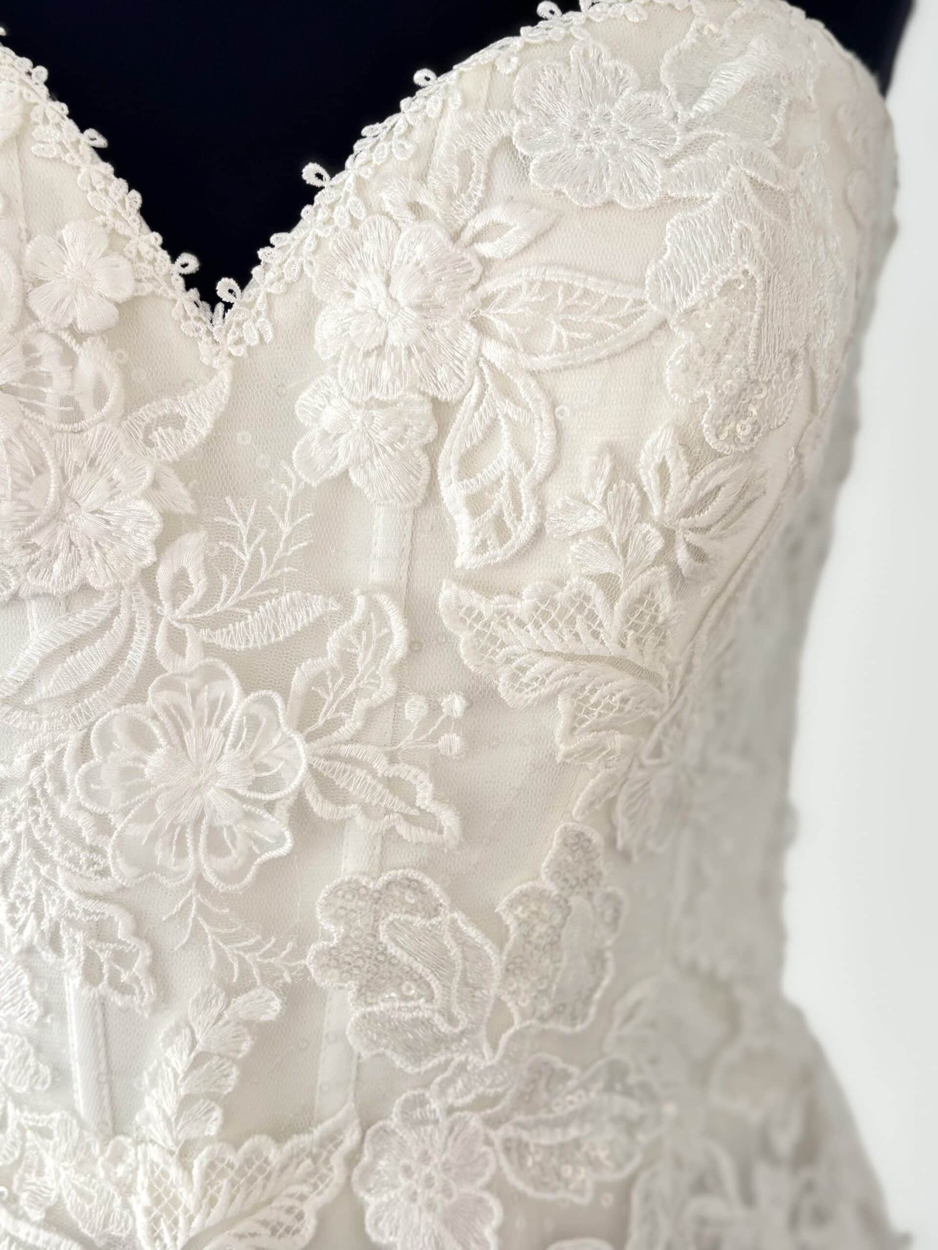 Son corsage en bustier cœur est délicatement orné de dentelle florale et de paillettes. Cette robe met en valeur la silhouette avec élégance. Sa jupe fluide en tulle, sublimée par des paillettes subtiles, crée une allure féerique, parfaite pour une cérémonie magique.
