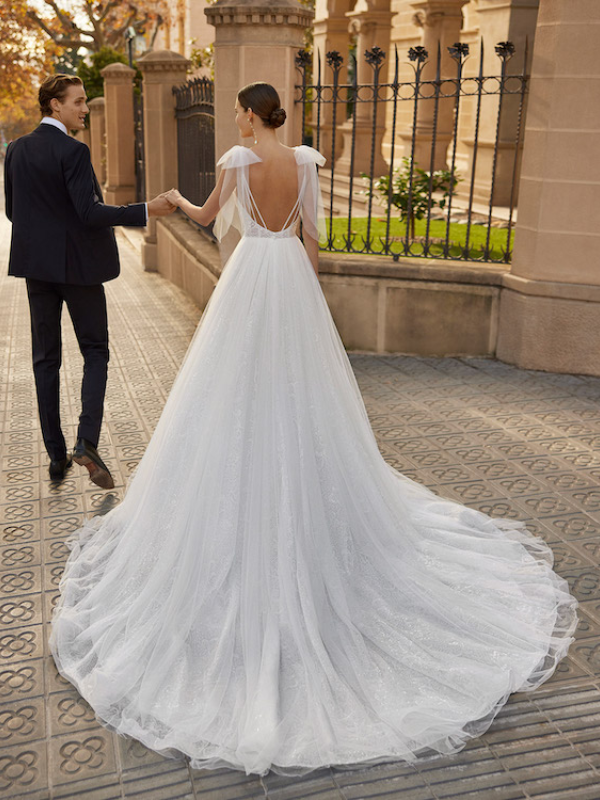 ✨ Détails : Style princesse. Buste travaillé en dentelle et pierreries. Décolleté V. Fines bretelles spaghettis en perles habillées de nœuds en tulle. Décolleté dos profond avec jeu de bretelles. Jupe en tulle avec sous-épaisseur de tulle pailleté à motifs. Longue traîne.