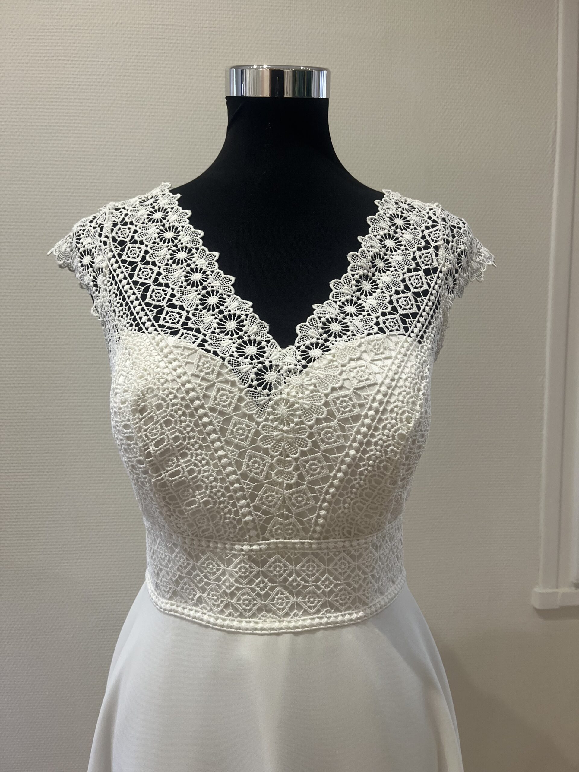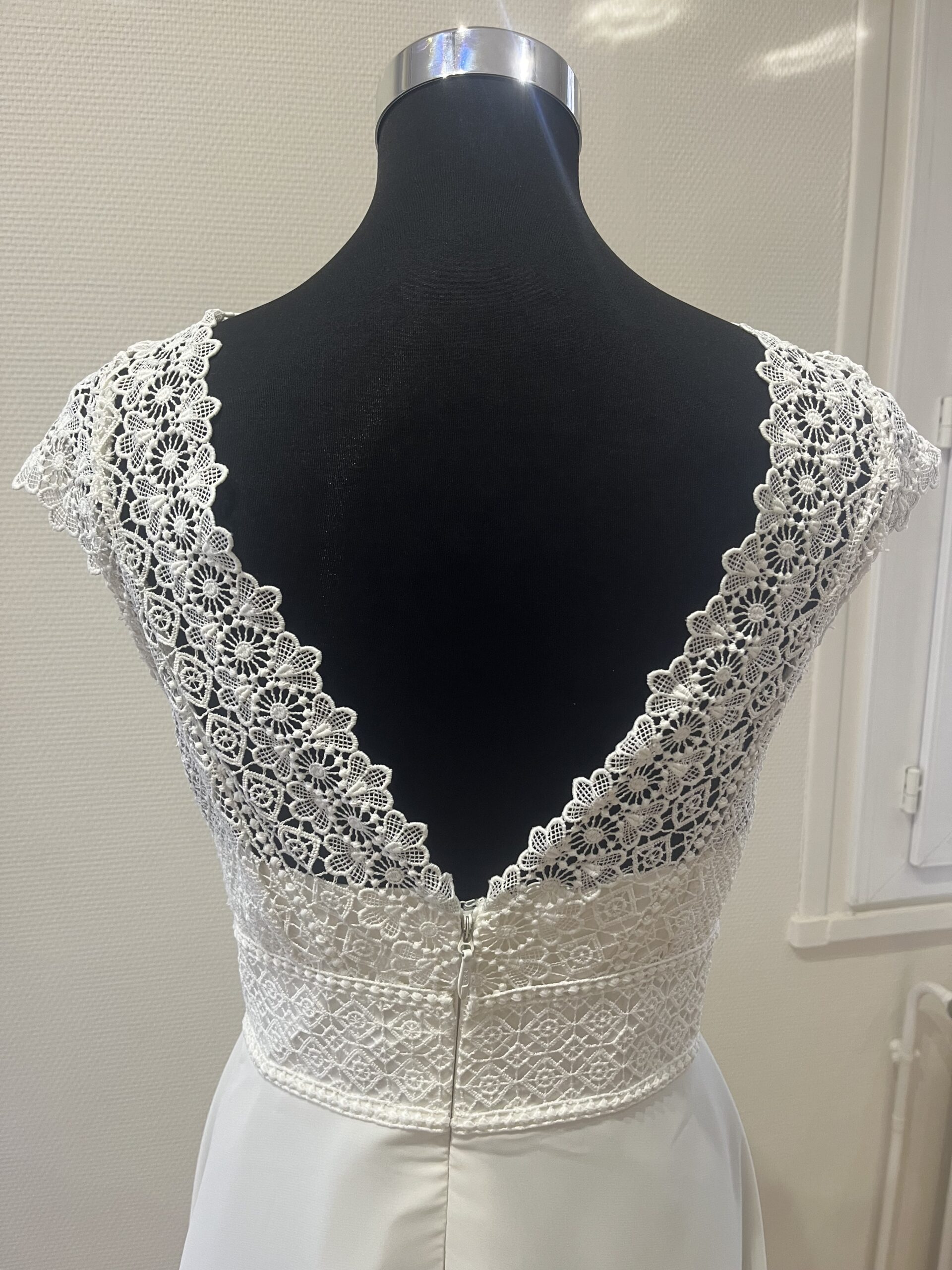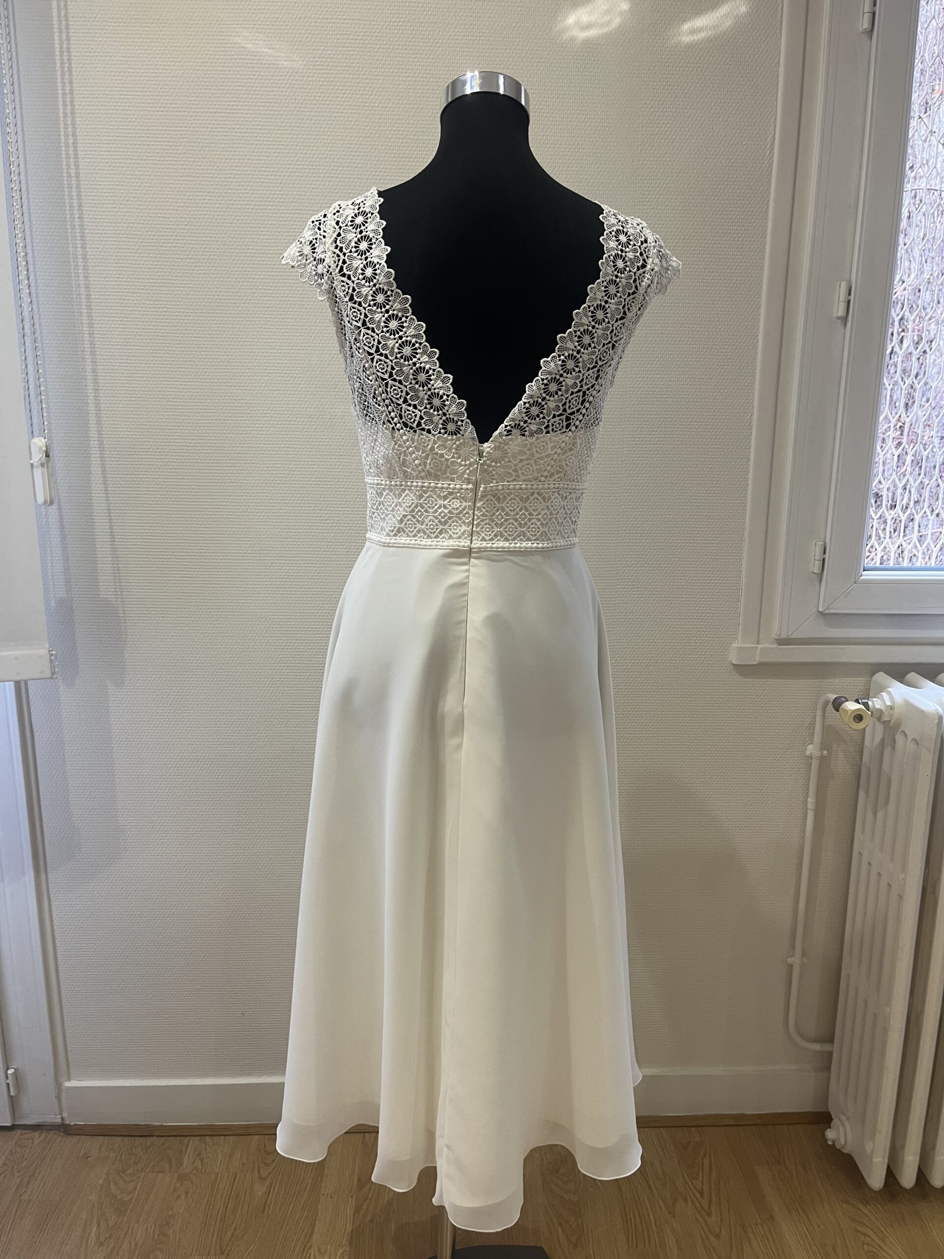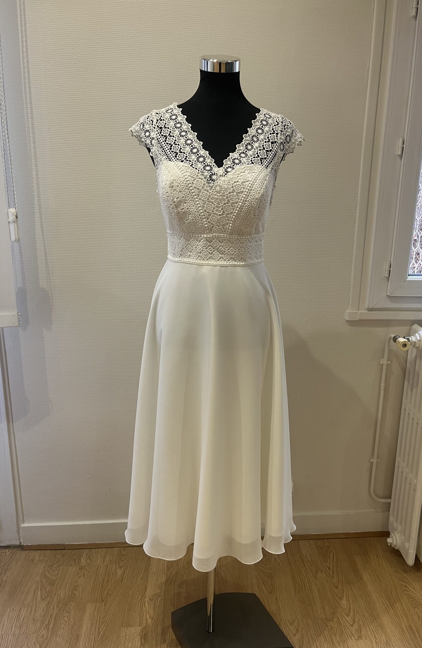 ✨ Détails : Coupe trapèze courte en dentelle graphique et tulle souple, décolleté bateau raffiné avec manches courtes délicates, dos fermé boutonné et jupe évasée vaporeuse pour une silhouette pétillante, gracieuse et résolument moderne.