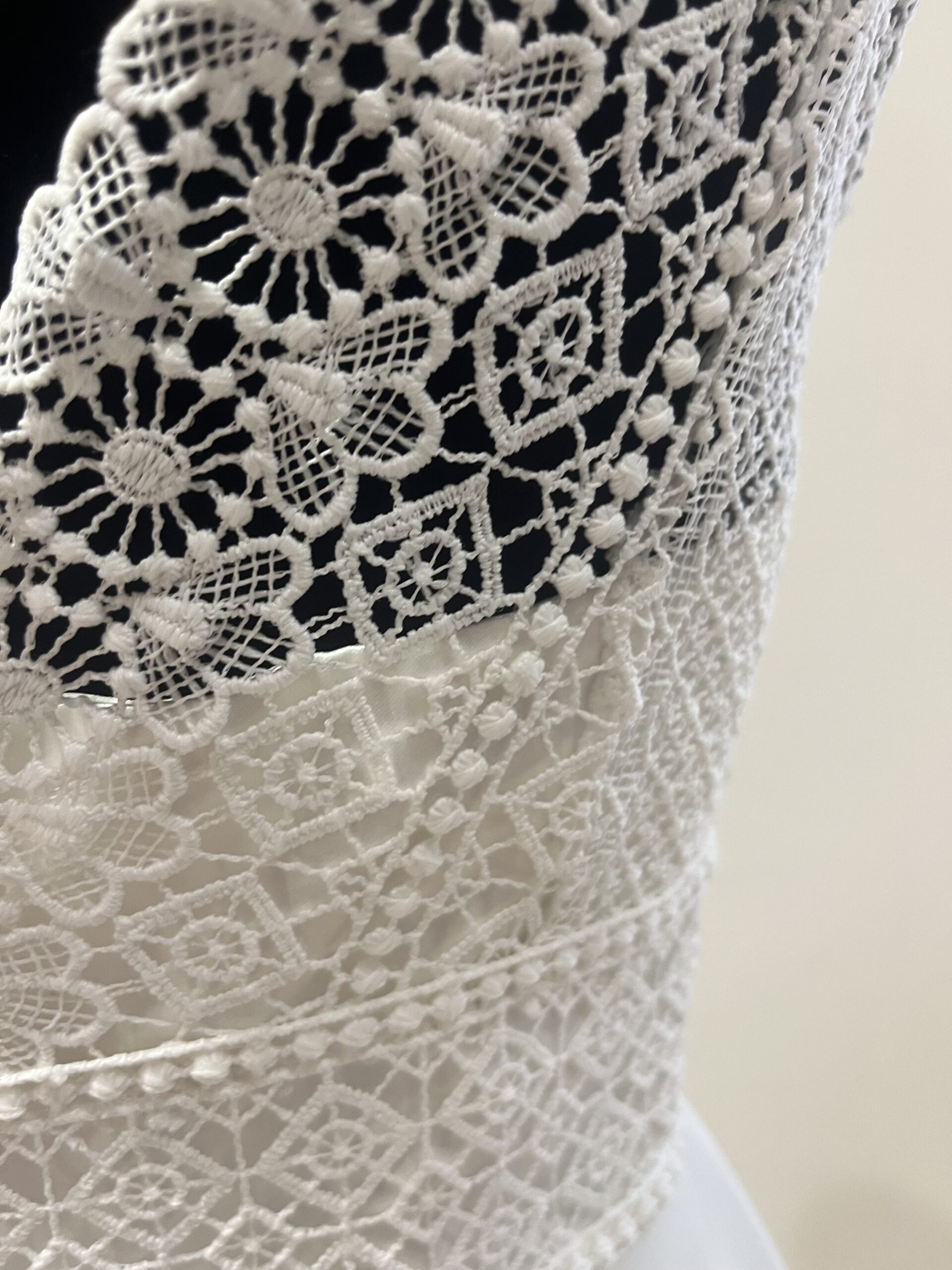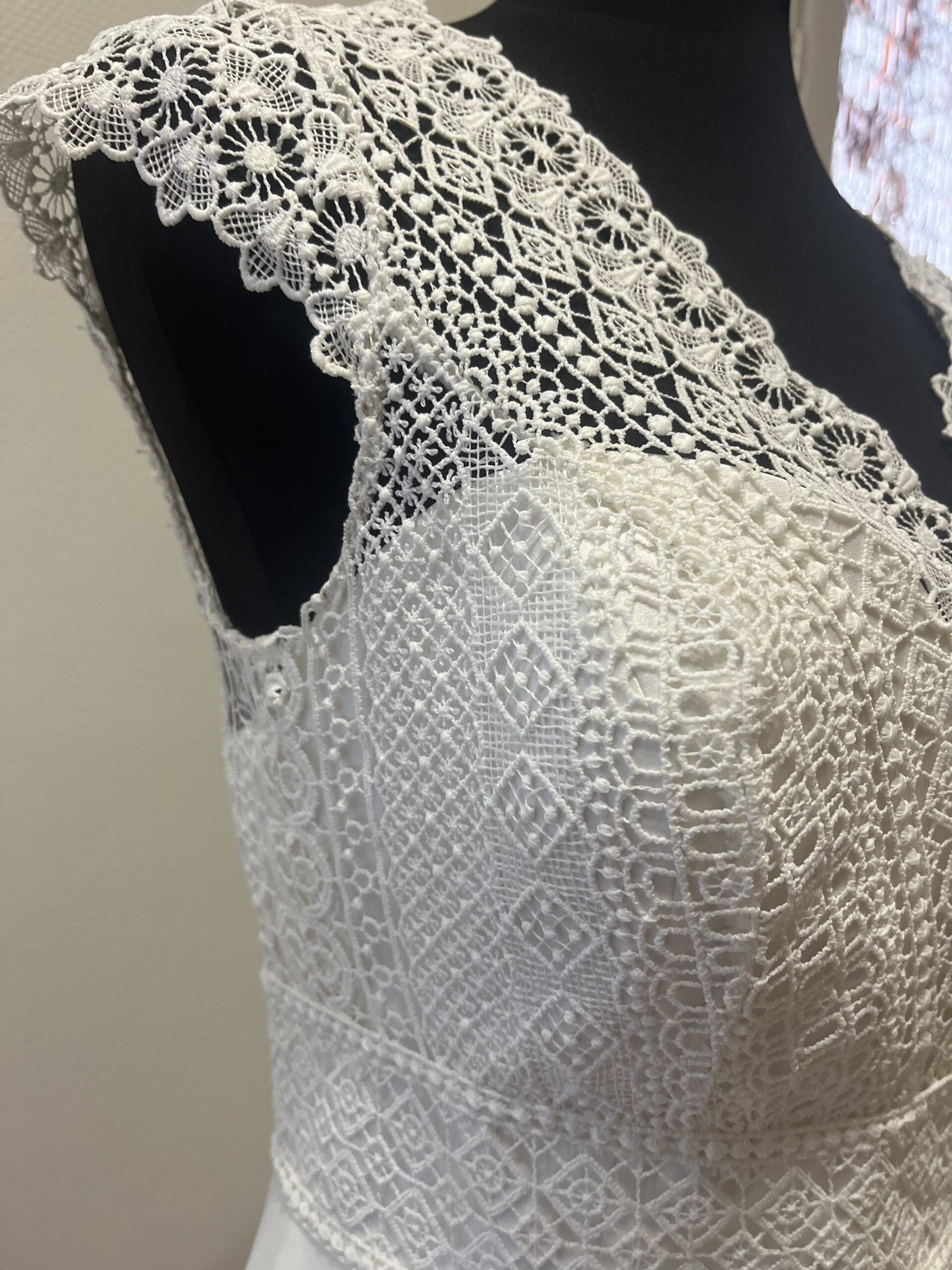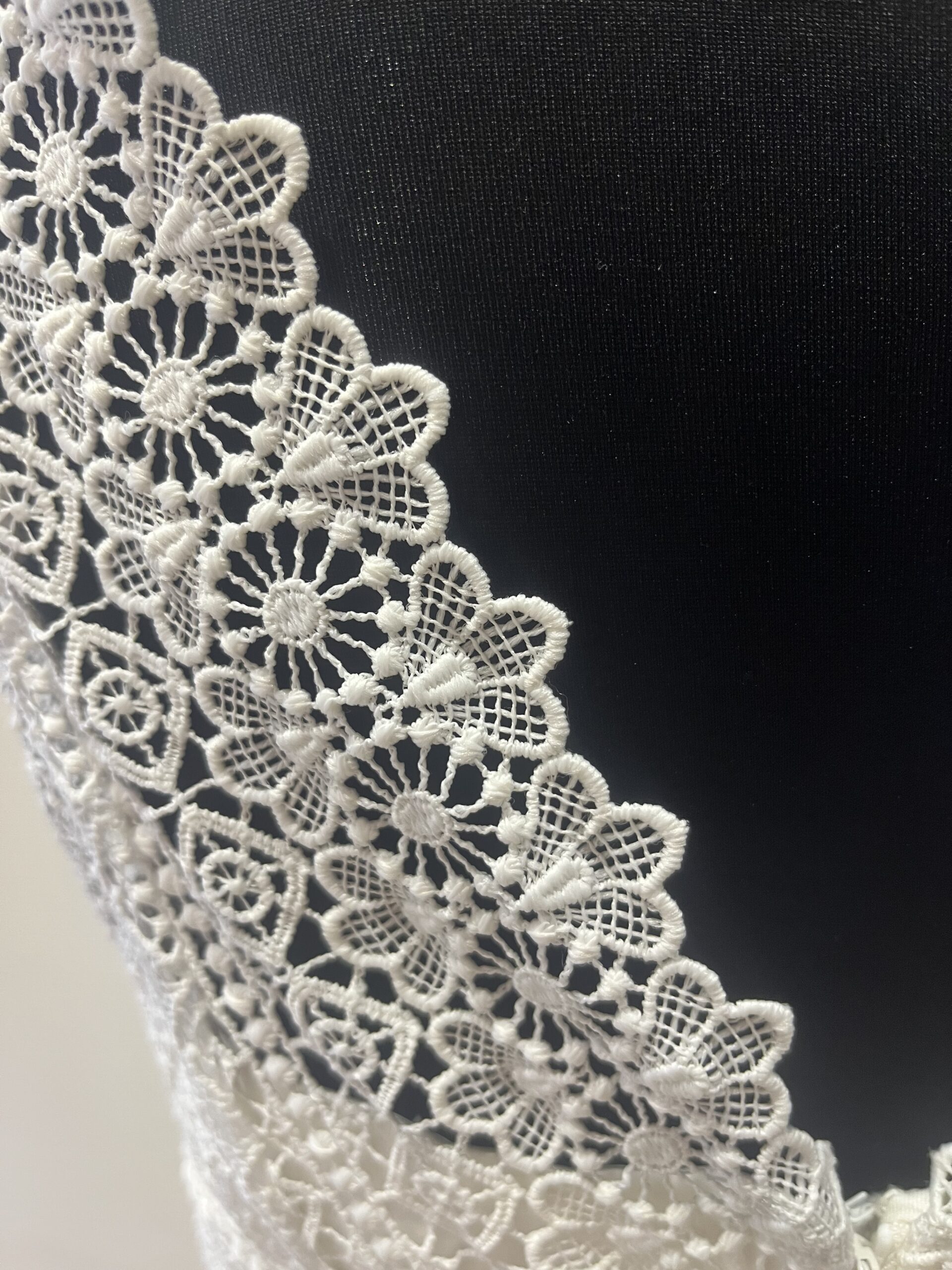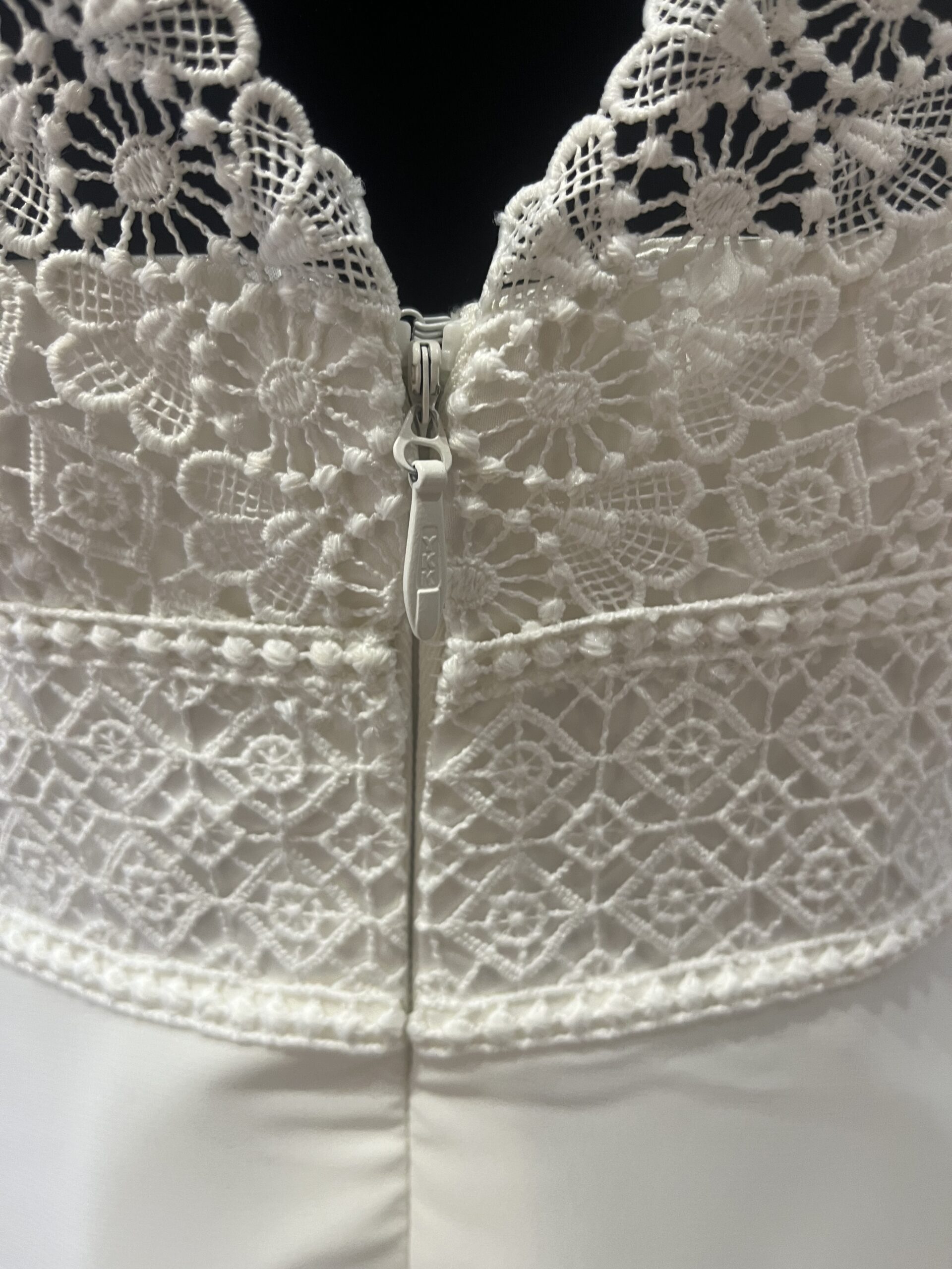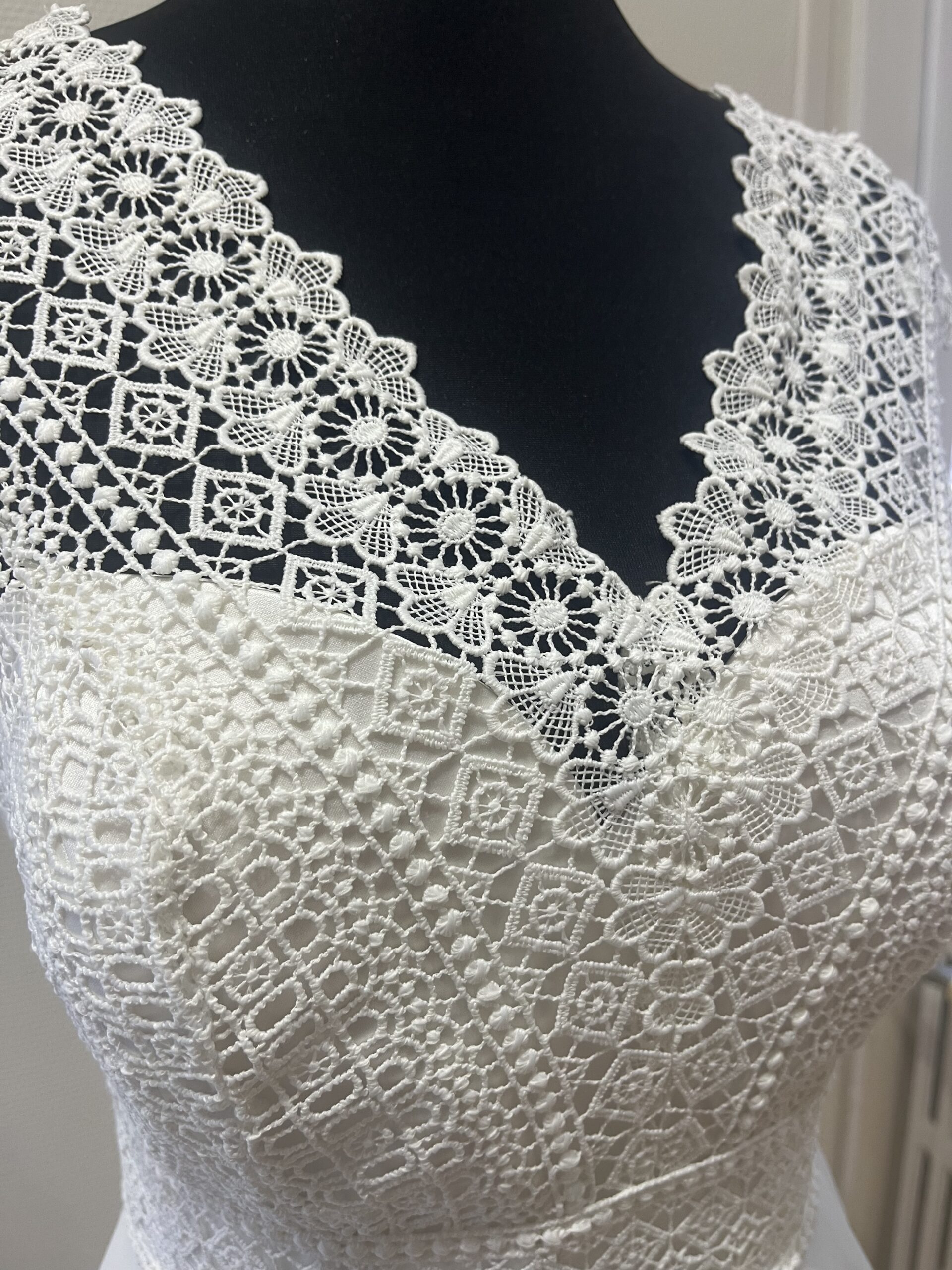 ✨ Détails : Coupe trapèze courte en dentelle graphique et tulle souple, décolleté bateau raffiné avec manches courtes délicates, dos fermé boutonné et jupe évasée vaporeuse pour une silhouette pétillante, gracieuse et résolument moderne.