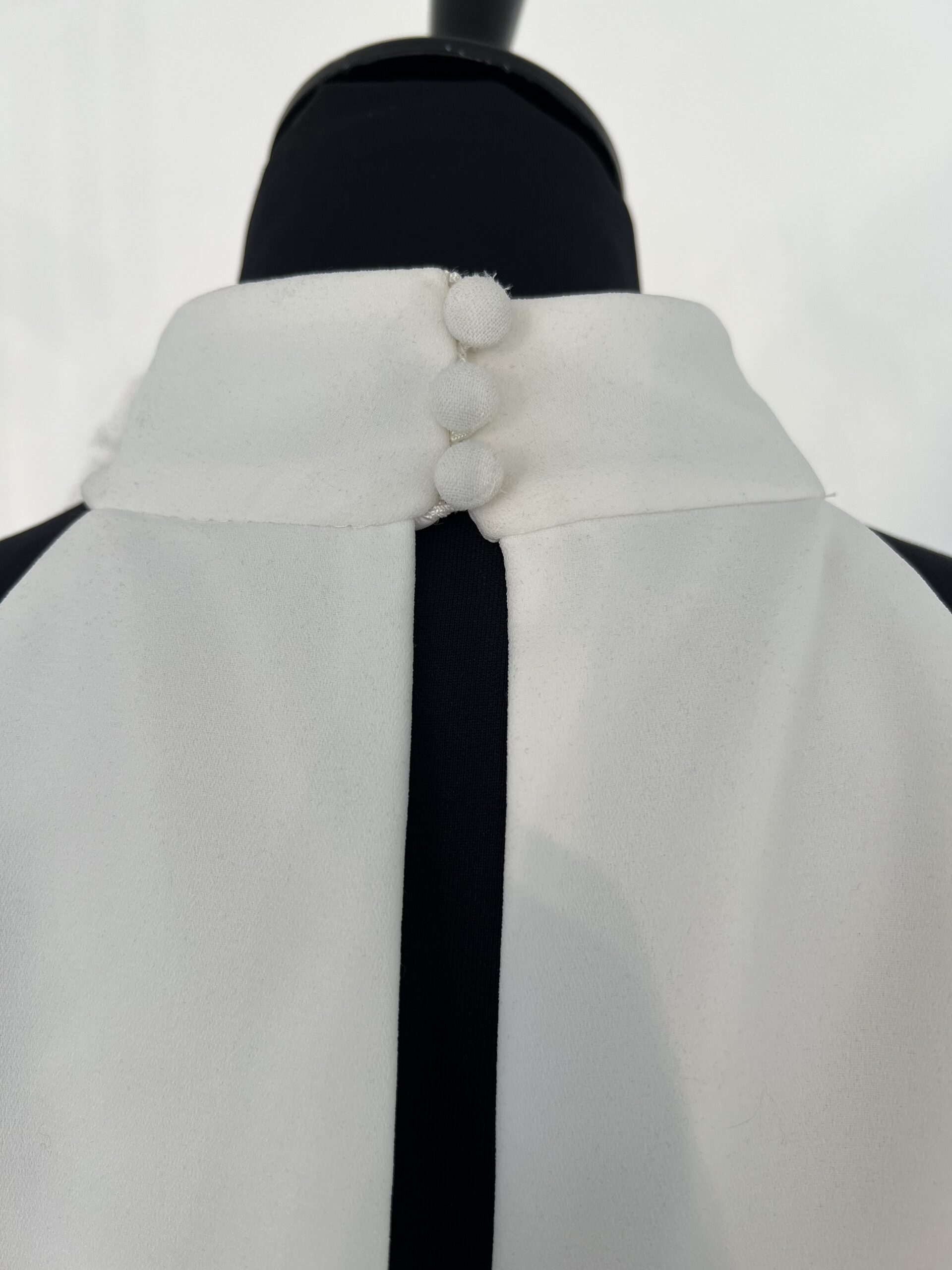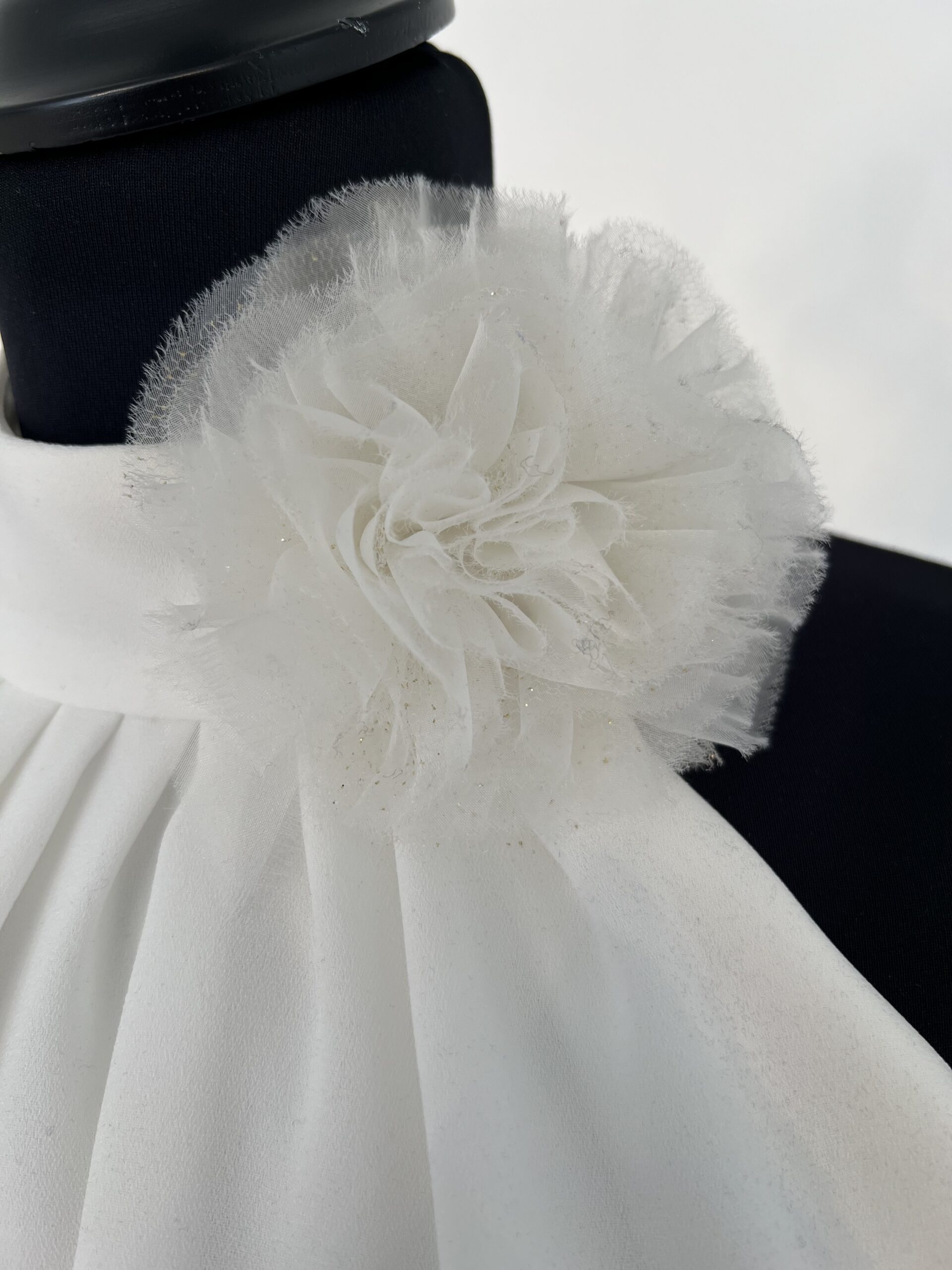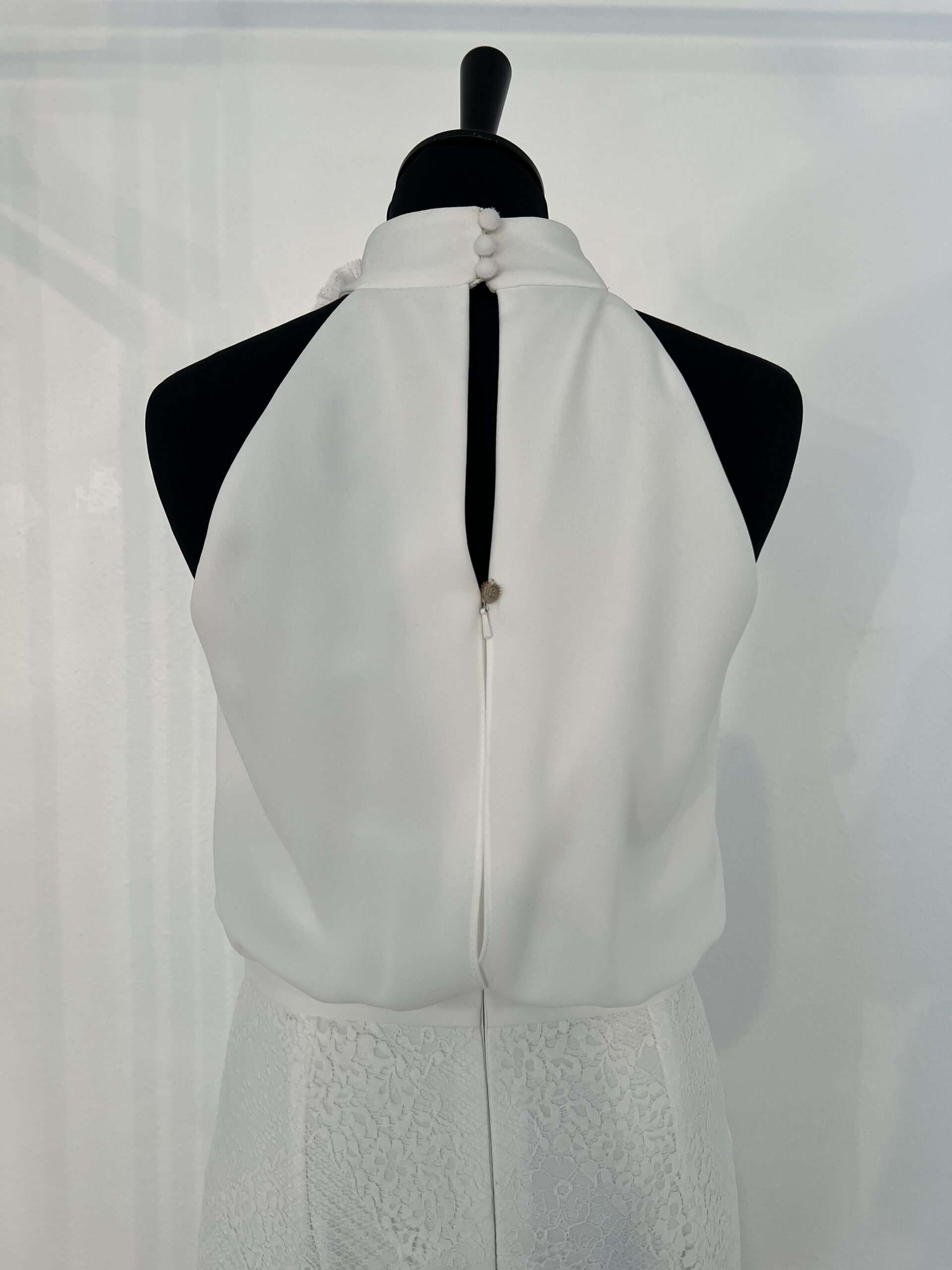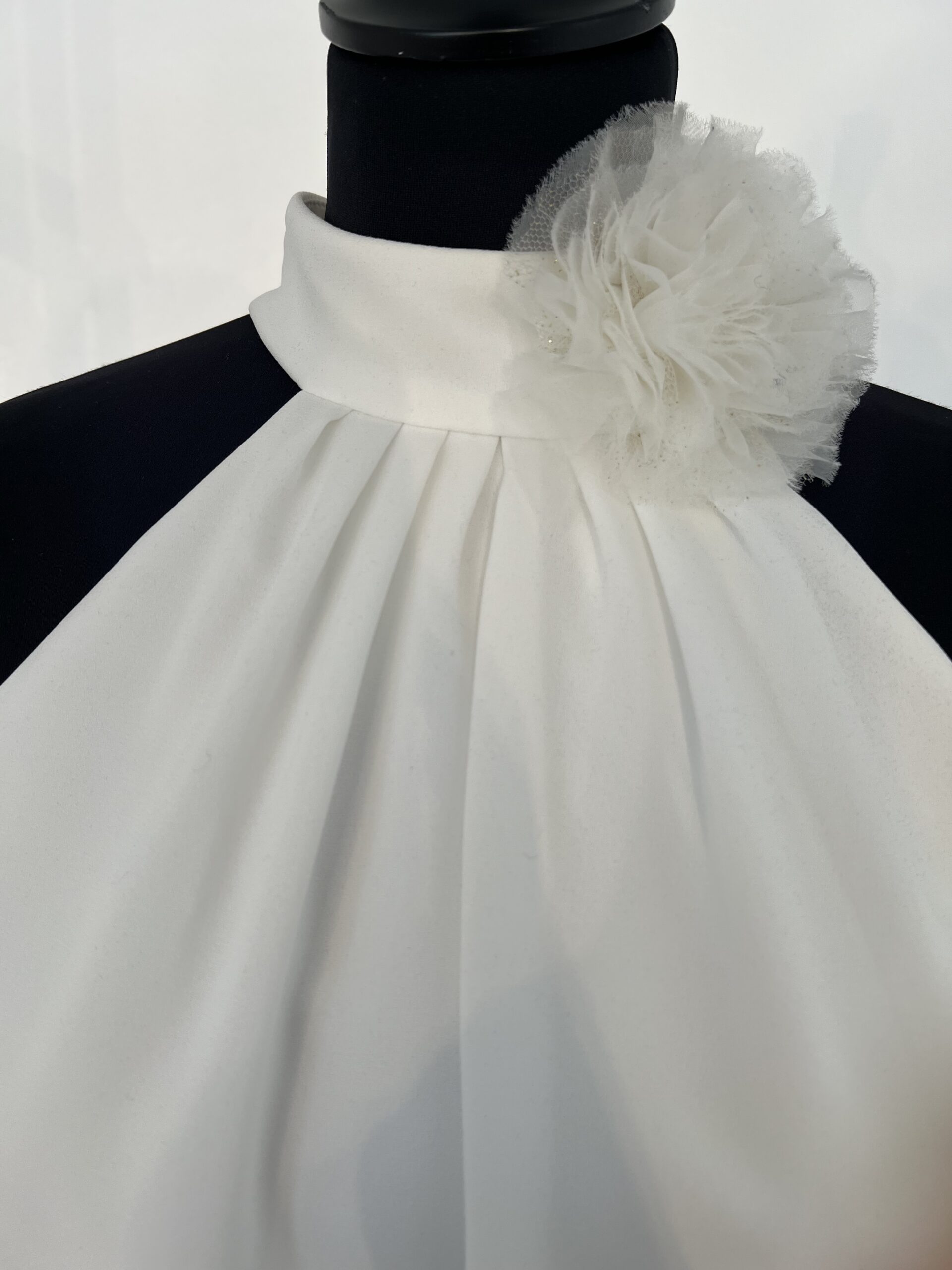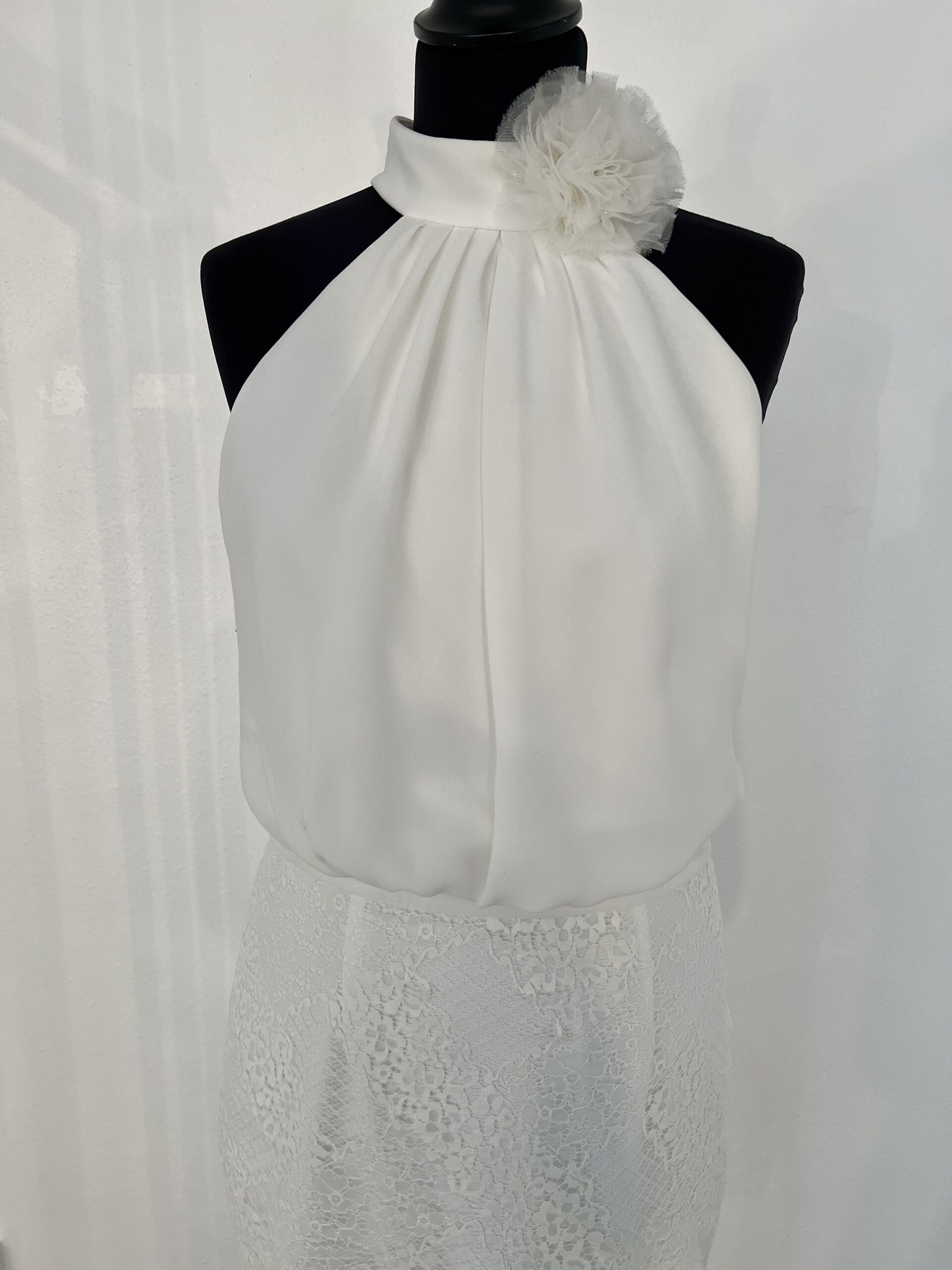 La silhouette droite met en valeur la jupe mi-longue en dentelle fine, ajustée avec délicatesse. Le haut fluide à col montant se distingue par un drapé élégant, sublimé par une fleur en tissu sur l’épaule, ajoutant une touche de féminité et de modernité.