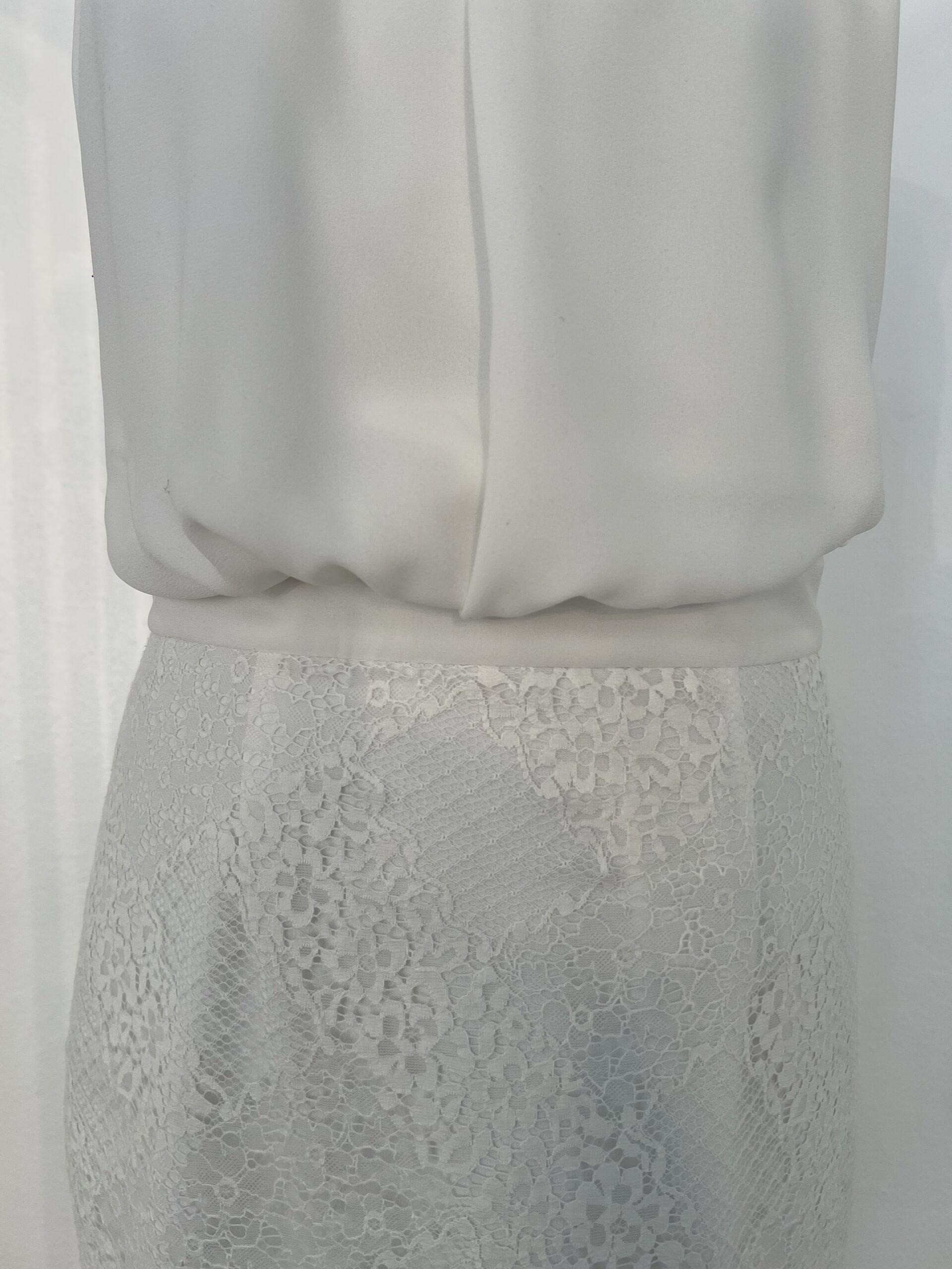 Détails : Coupe droite, jupe mi-longue en dentelle fine, top fluide à col montant, drapé, fleur en tissu sur l’épaule.