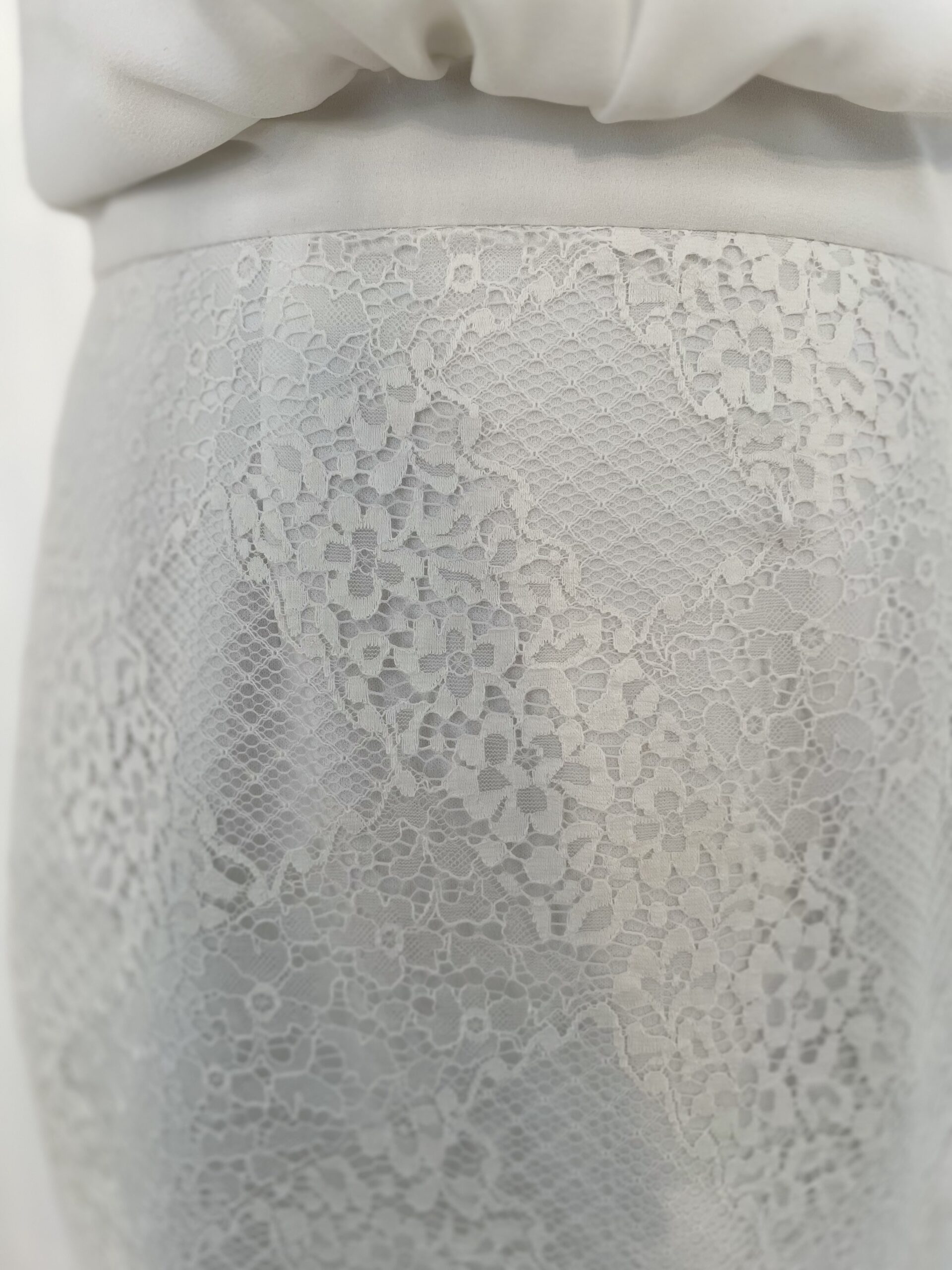 Détails : Silhouette droite, jupe mi-longue en dentelle fine, top fluide à col montant, drapé élégant, fleur en tissu sur le côté, jupe ajustée et légère, créant un contraste subtil avec le haut.