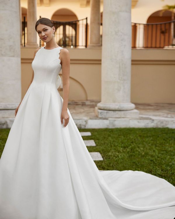 ✨ Détails : Robe de mariée princesse, tissu Sienne, décolleté rond, dos ouvert, nœud asymétrique au dos, silhouette fluide et élégante, création signée Rosa Clara.