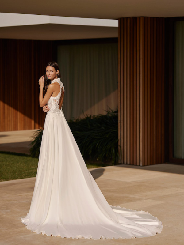 Détails : Corsage en dentelle florale avec col montant, dos nu et arrondi avec détails en dentelle, jupe fluide en mousseline.