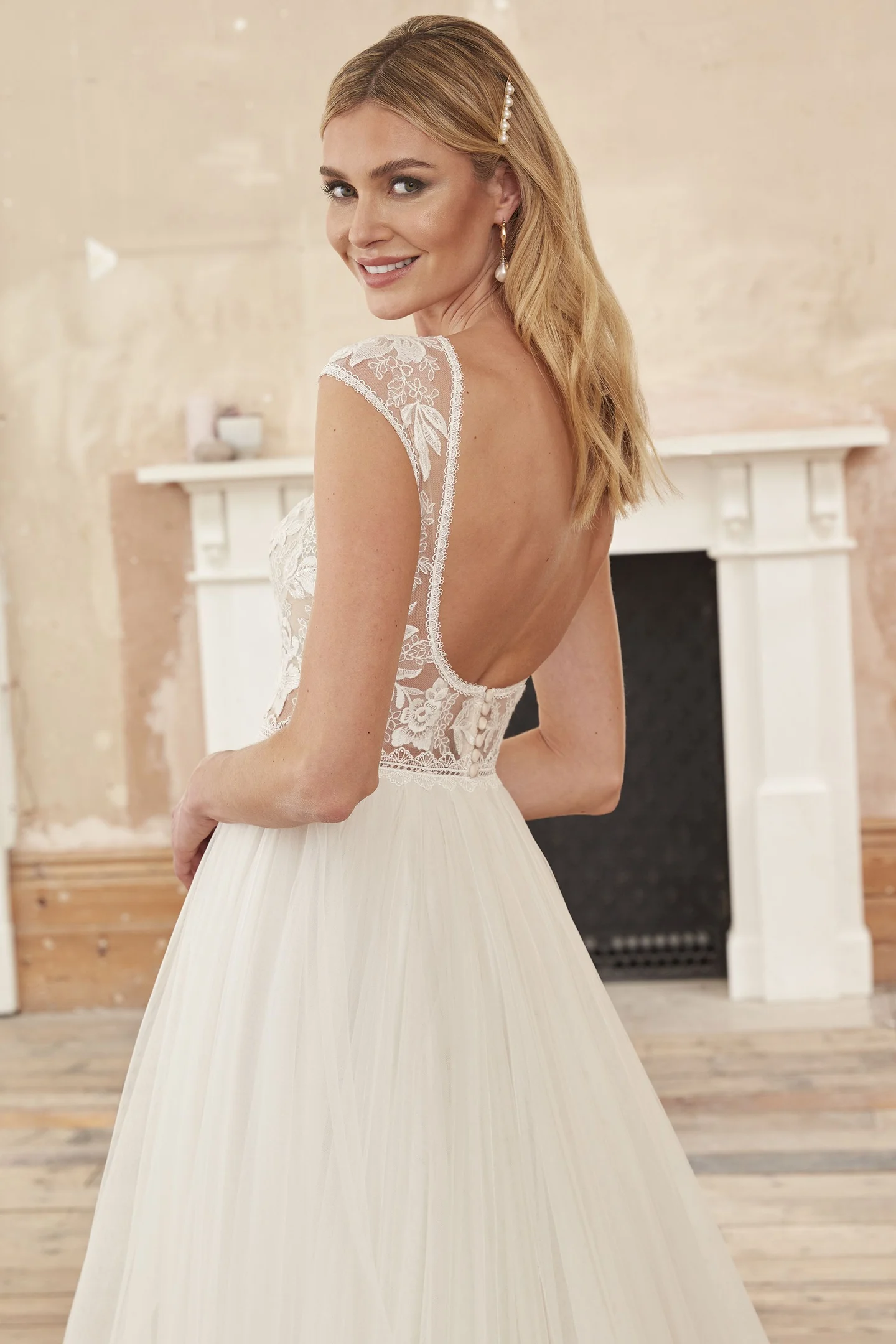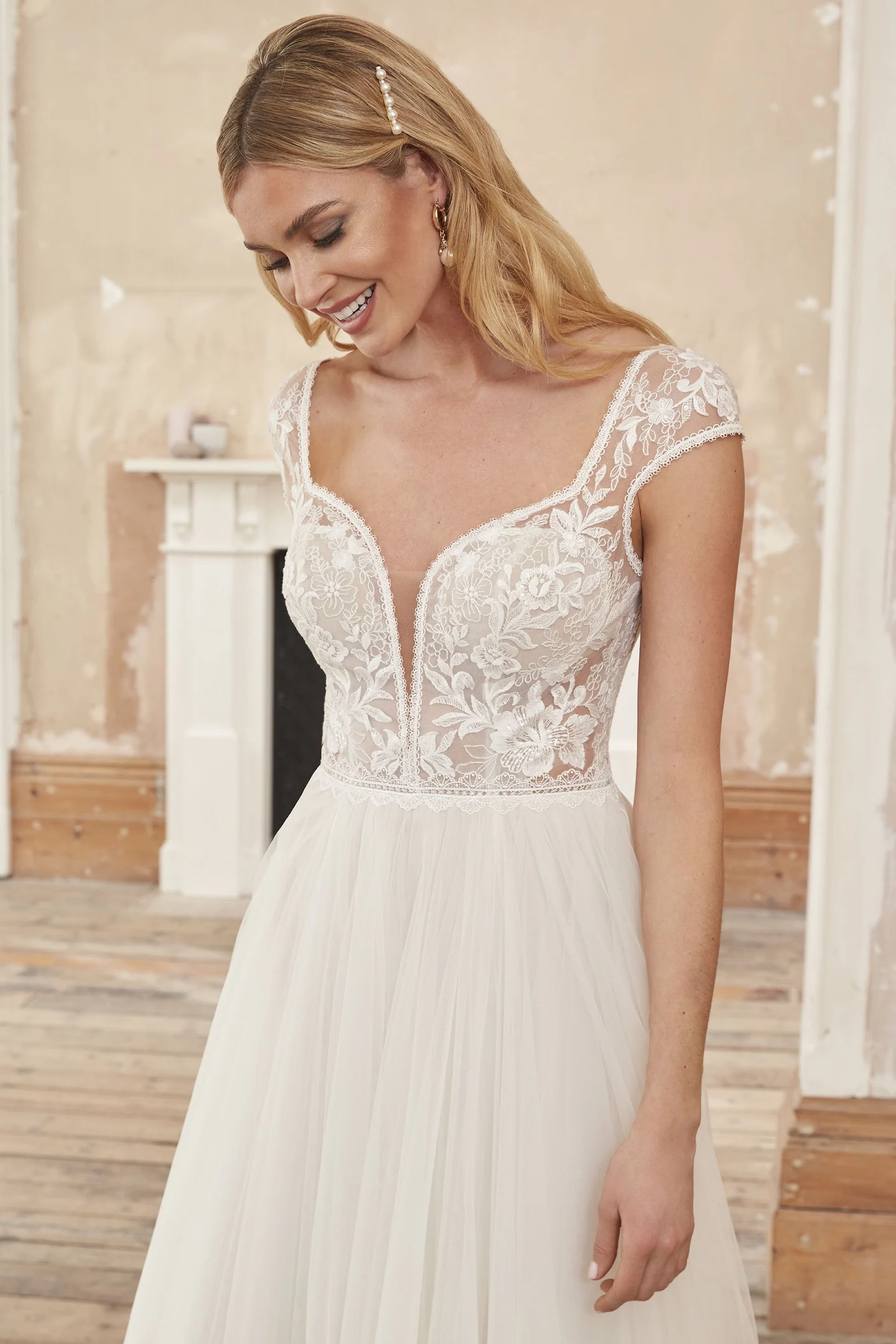 ✨ Détails : Silhouette trapèze en tulle doux, corsage à illusion en dentelle, décolleté plongeant, fines épaules en dentelle, taille mise en valeur par de subtiles découpes et traîne chapelle pour une allure légère et raffinée.