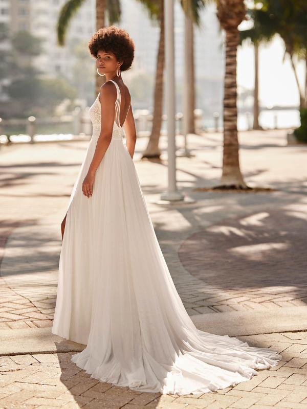 Détails : Corsage en dentelle orné de pierreries, encolure ras-du-cou, dos ouvert décoré de dentelle, jupe droite en mousseline fluide avec fente élégante sur le devant.