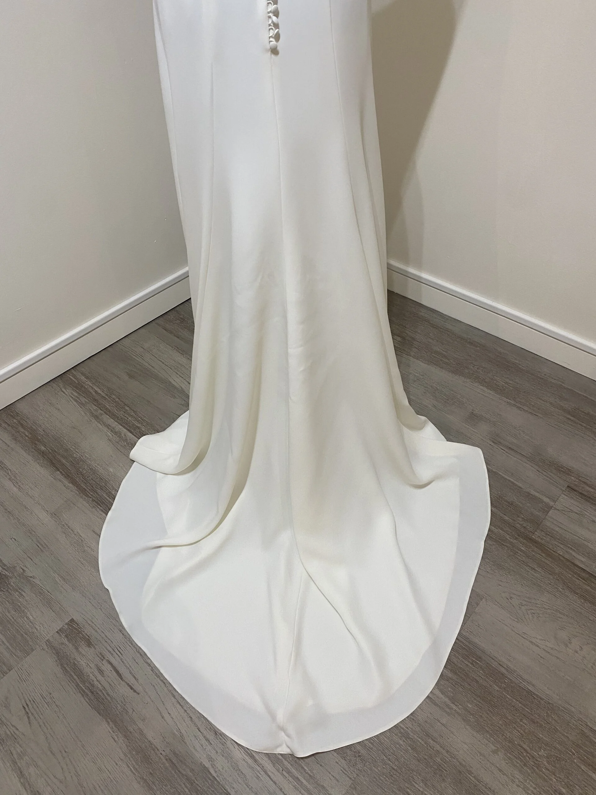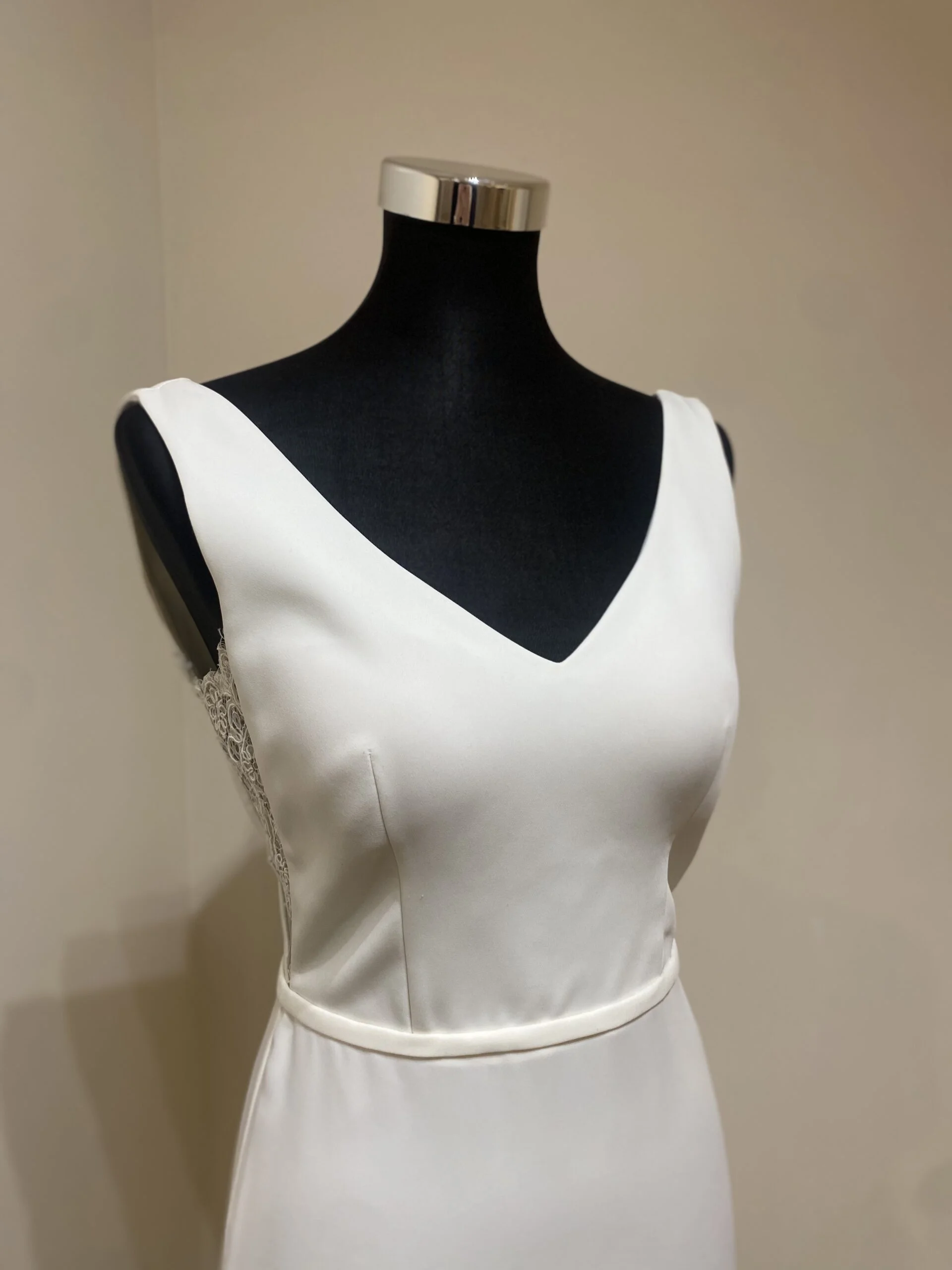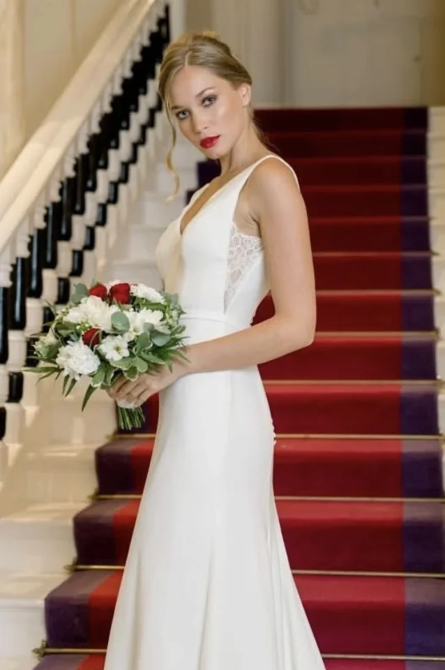 ✨ Détails : Ligne fourreau épurée en crêpe fluide, décolleté en V plongeant et larges bretelles, empiècements de dentelle florale sur les côtés, dos ouvert et traîne élégante pour une silhouette minimaliste et chic.