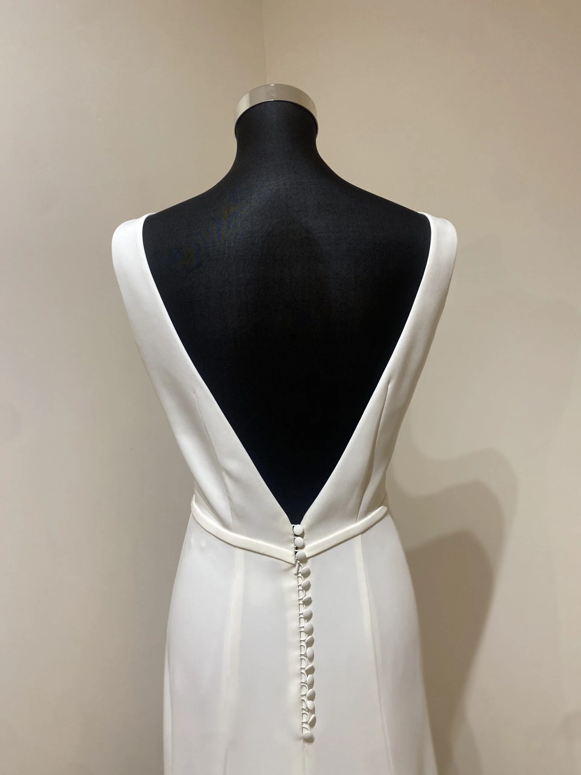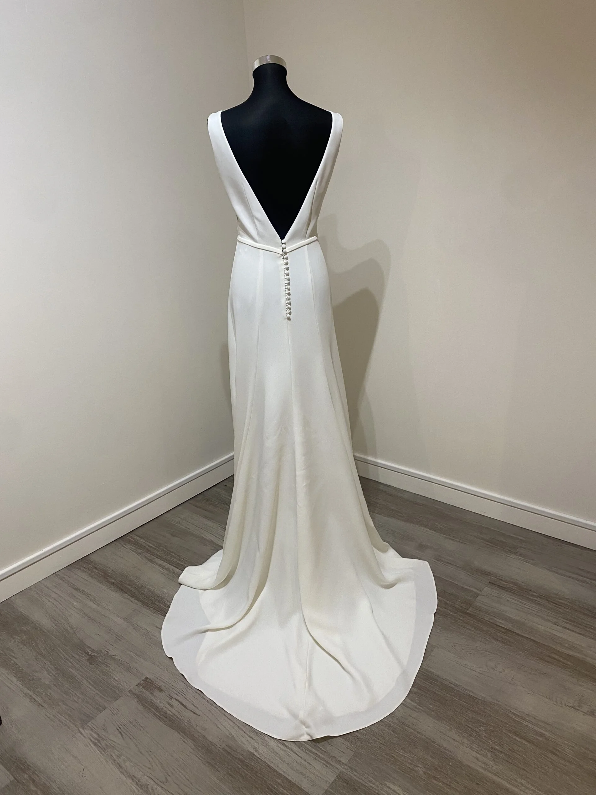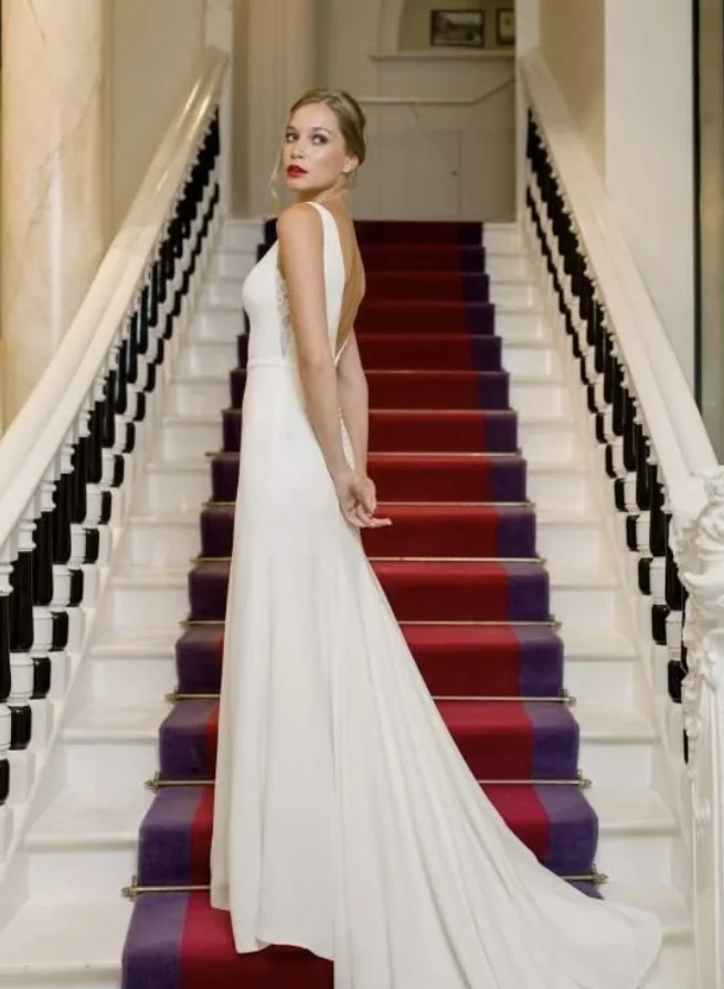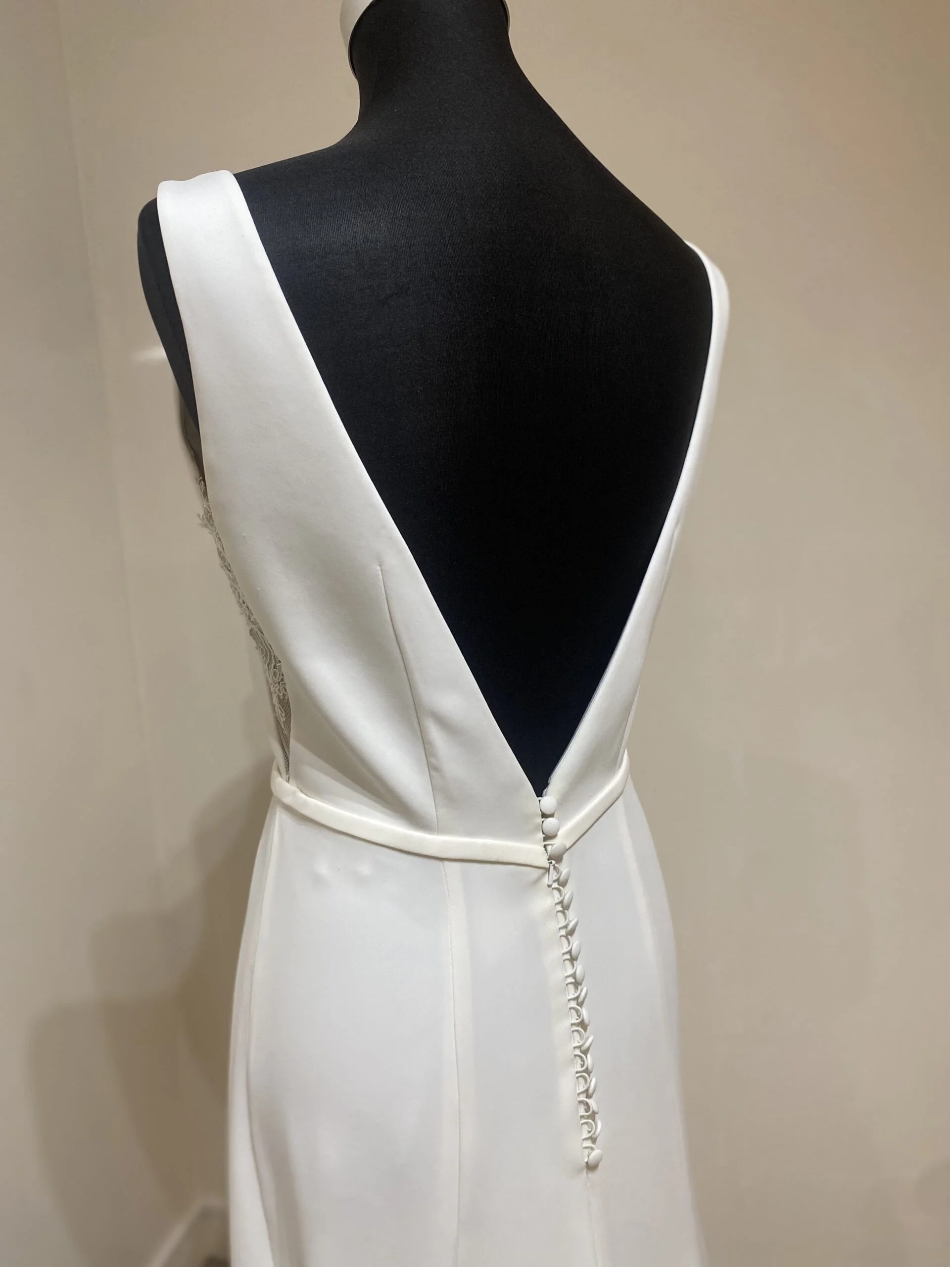 ✨ Détails : Ligne fourreau épurée en crêpe fluide, décolleté en V plongeant et larges bretelles, empiècements de dentelle florale sur les côtés, dos ouvert et traîne élégante pour une silhouette minimaliste et chic.