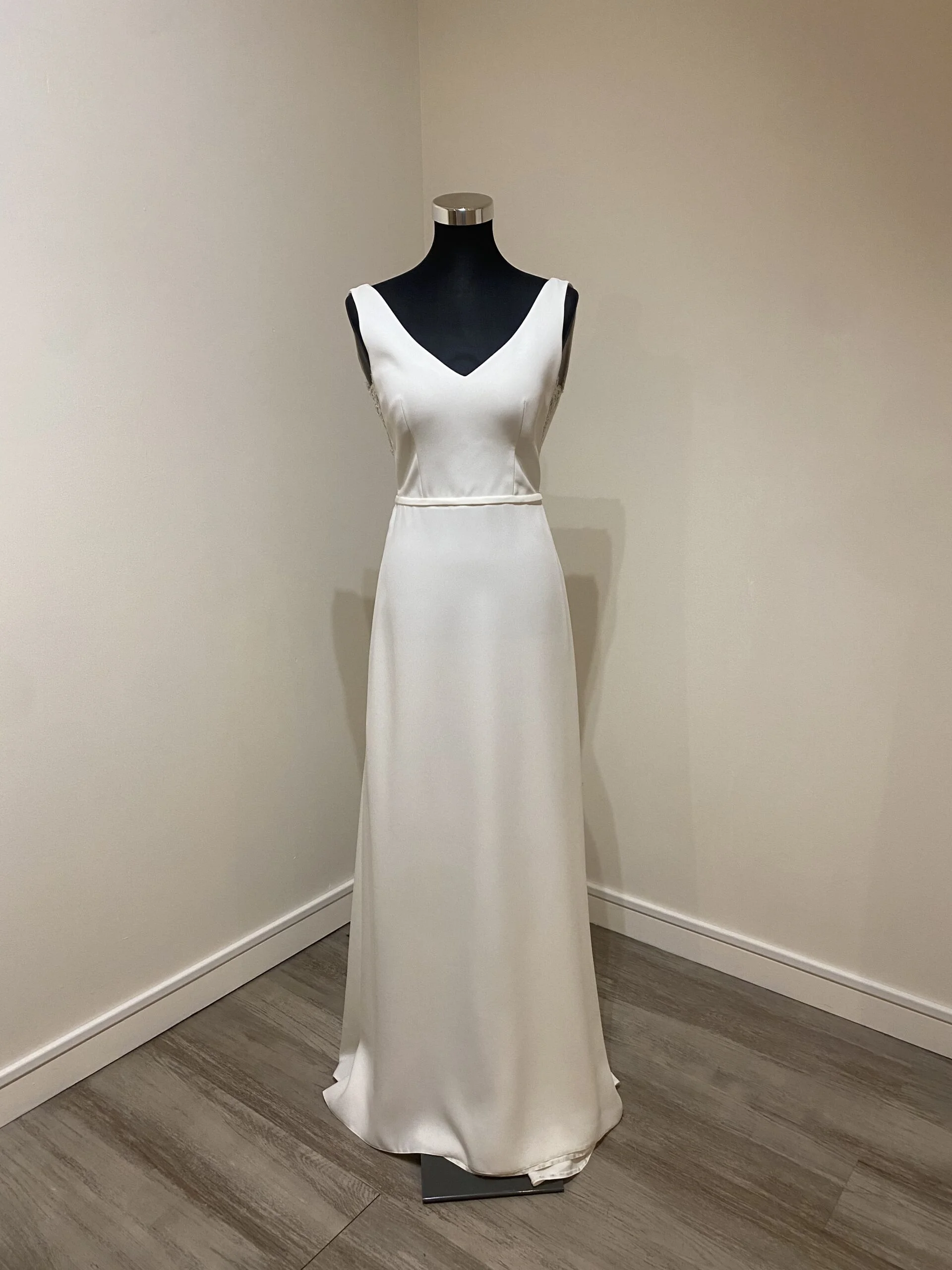 La robe de mariée Rivna Angeola allie simplicité et élégance avec son bustier à décolleté en V et ses bretelles larges. Son design épuré crée une silhouette sophistiquée et féminine, agrémentée de délicats détails en dentelle sur les côtés pour une allure moderne. Confectionnée dans des matières fluides et raffinées, cette robe incarne la beauté de la simplicité tout en mettant en valeur la silhouette avec une touche de grâce discrète.