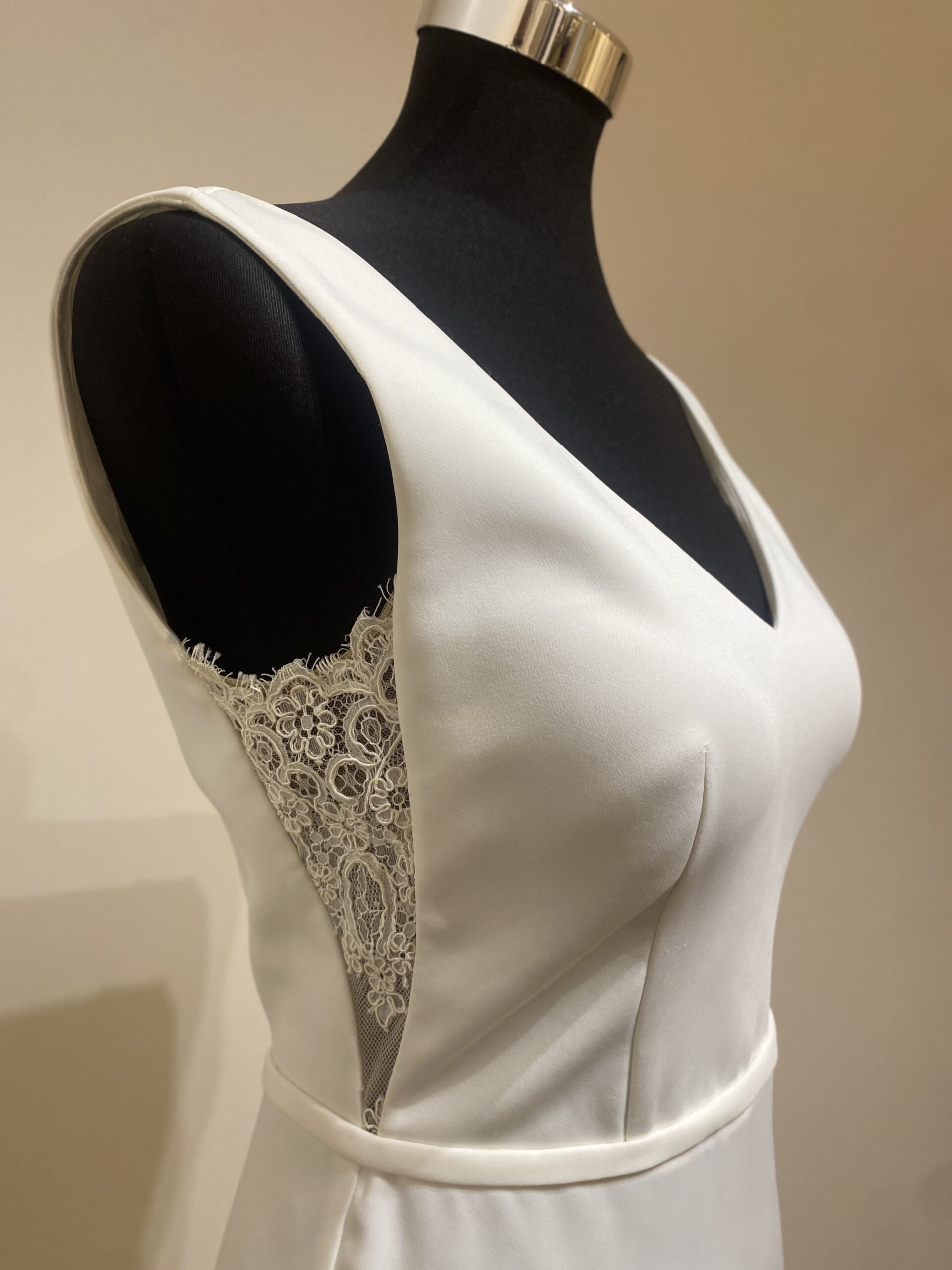 ✨ Détails : Ligne fourreau épurée en crêpe fluide, décolleté en V plongeant et larges bretelles, empiècements de dentelle florale sur les côtés, dos ouvert et traîne élégante pour une silhouette minimaliste et chic.
