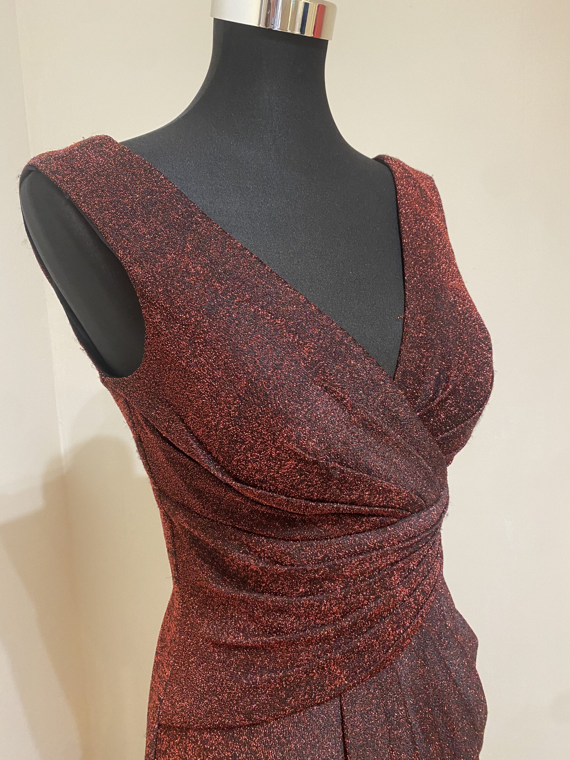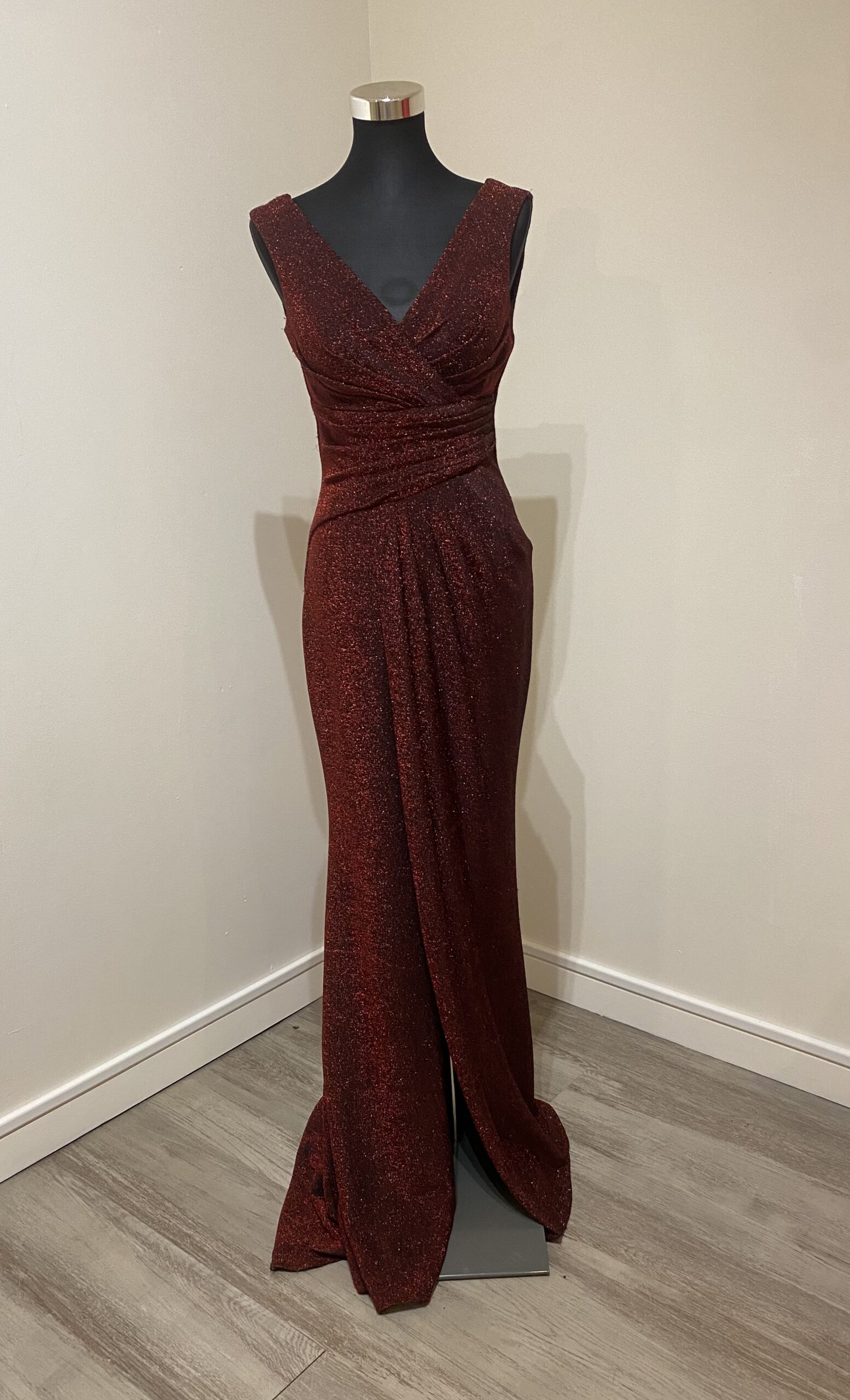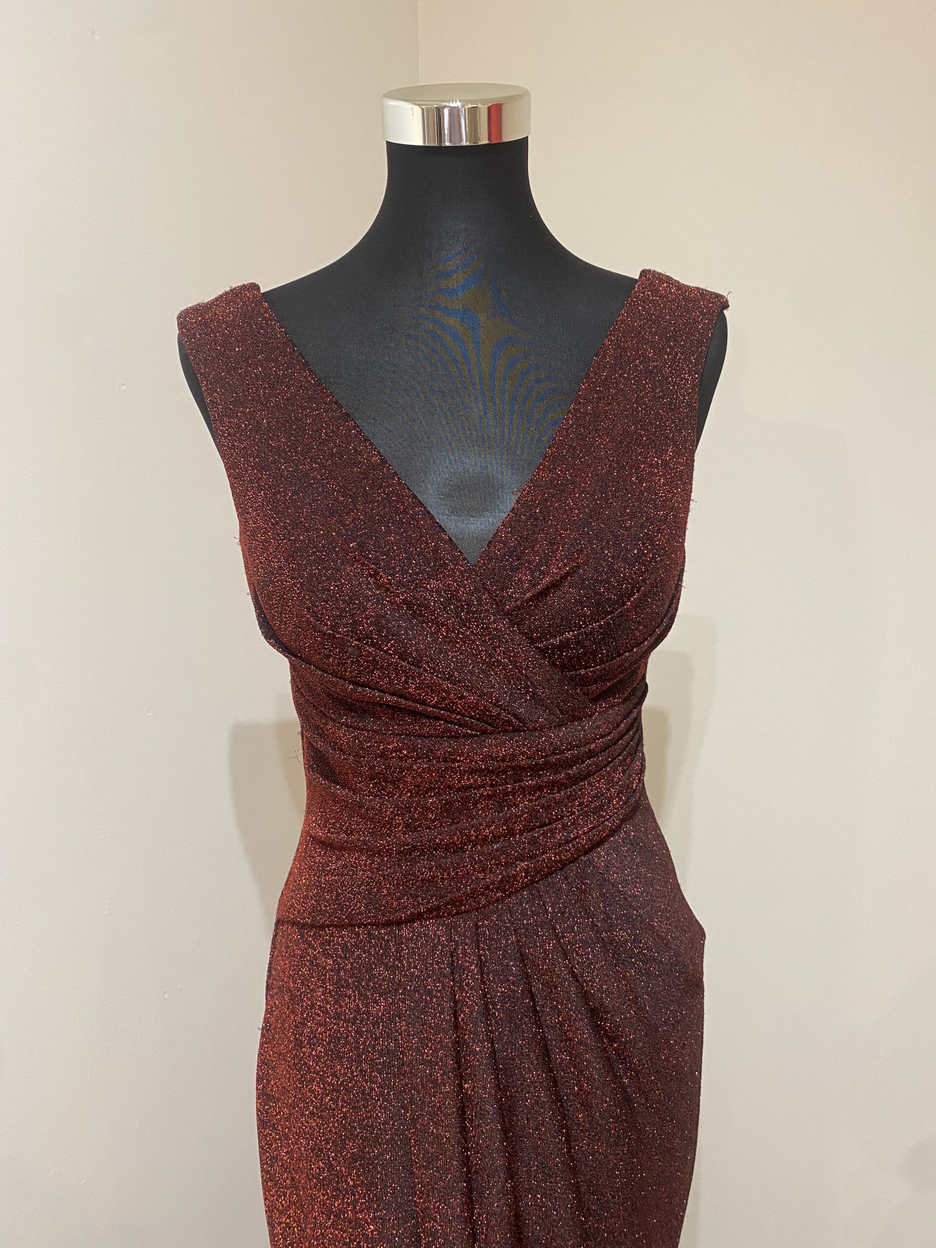 Sublimez votre silhouette avec cette robe de soirée d’exception, une pièce maîtresse alliant glamour intemporel et sophistication moderne. Confectionnée dans un tissu au fini délicatement pailleté, elle capte la lumière à chaque mouvement pour un effet spectaculaire. Sa coupe fourreau est magnifiée par un drapé savamment travaillé à la taille, créant un effet sculptant qui flatte toutes les morphologies. Le décolleté en V croisé apporte une touche de féminité raffinée, tandis que la fente latérale audacieuse dévoile la jambe avec élégance, facilitant une démarche fluide et aérienne. Idéale pour un gala, un mariage prestigieux ou une soirée tapis rouge, cette robe dans un ton bordeaux profond est la promesse d’une allure inoubliable.