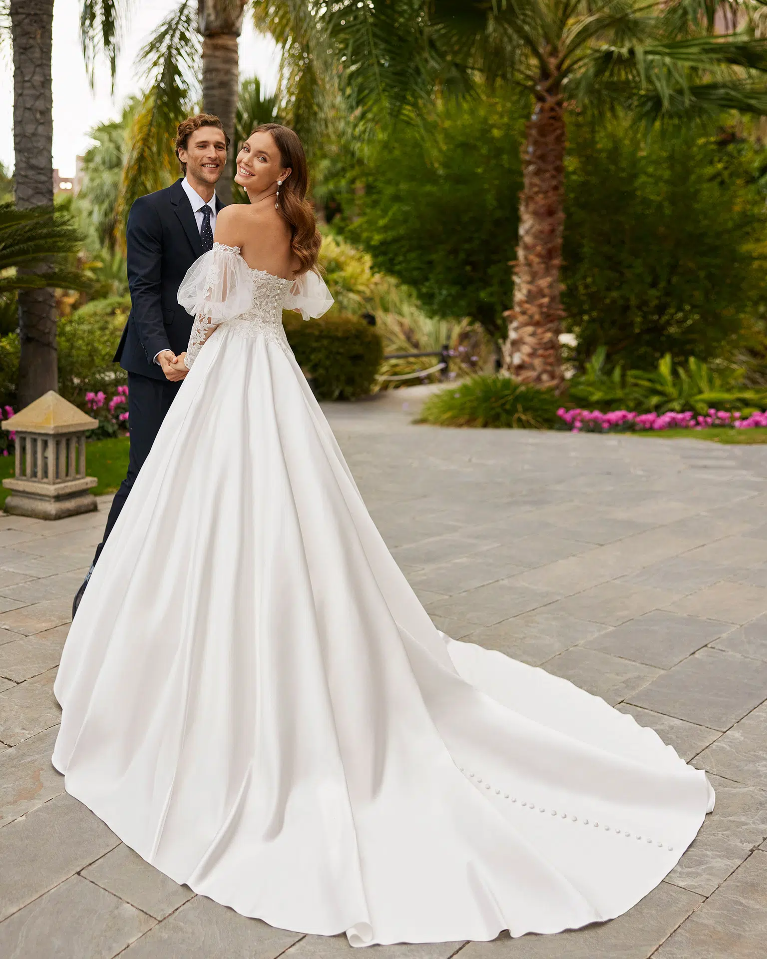 Le secret du modèle Horata réside dans l’utilisation du mikado, une matière dense et lumineuse qui permet de créer des volumes nets et graphiques. Contrairement aux matières fluides, le mikado sculpte littéralement la silhouette, offrant un maintien impeccable au niveau du bustier avant de s’évaser en une jupe majestueuse. C’est la robe idéale pour une mariée qui souhaite une allure structurée et un tombé lourd et luxueux.