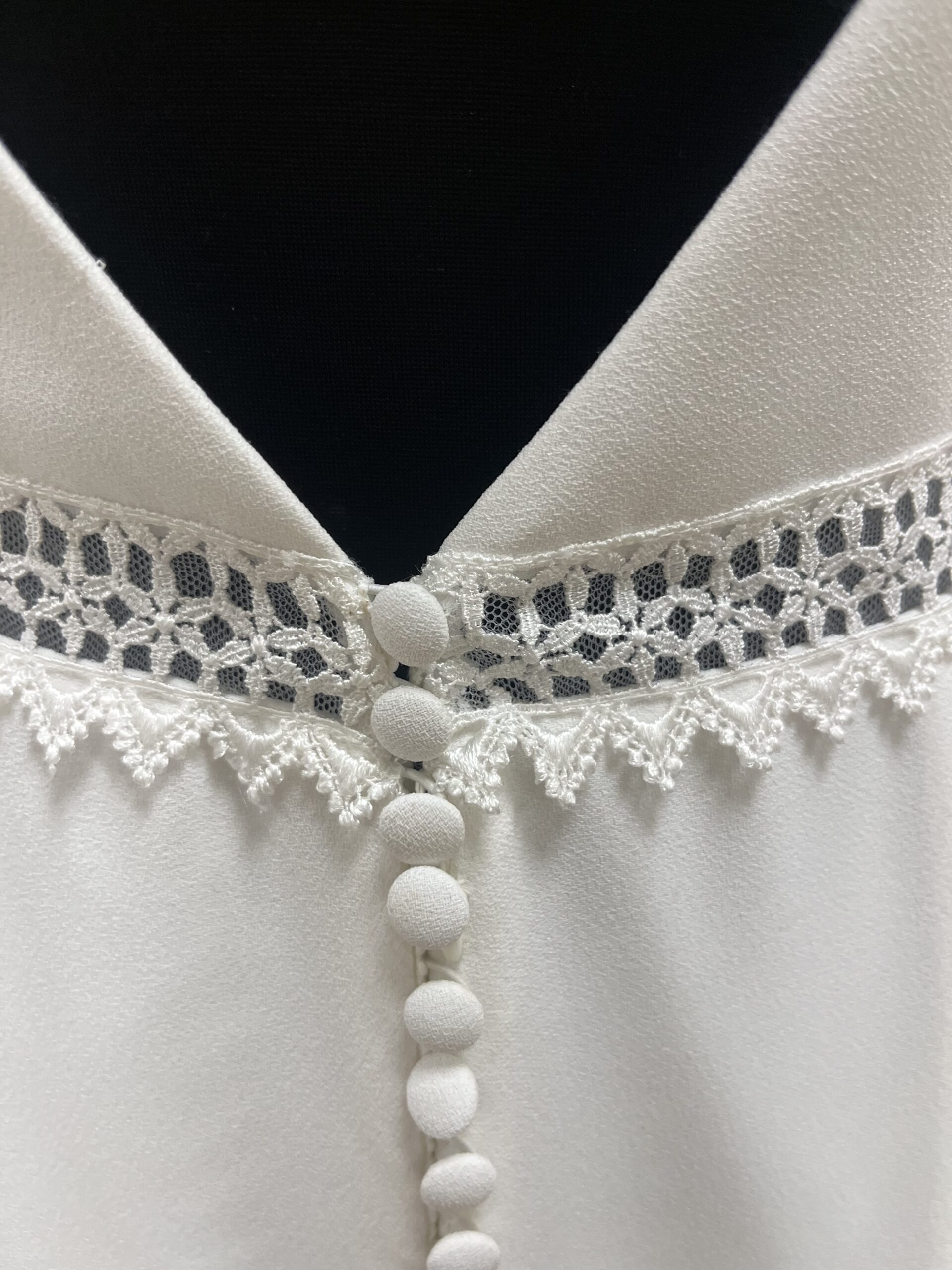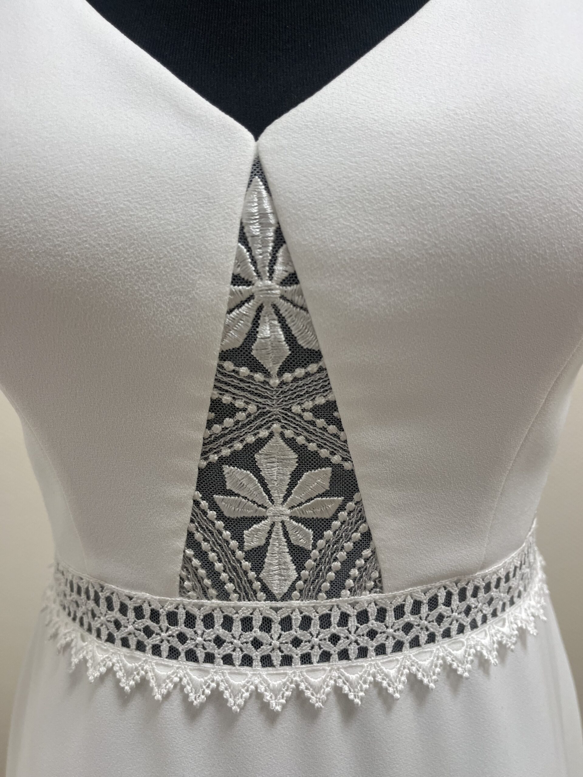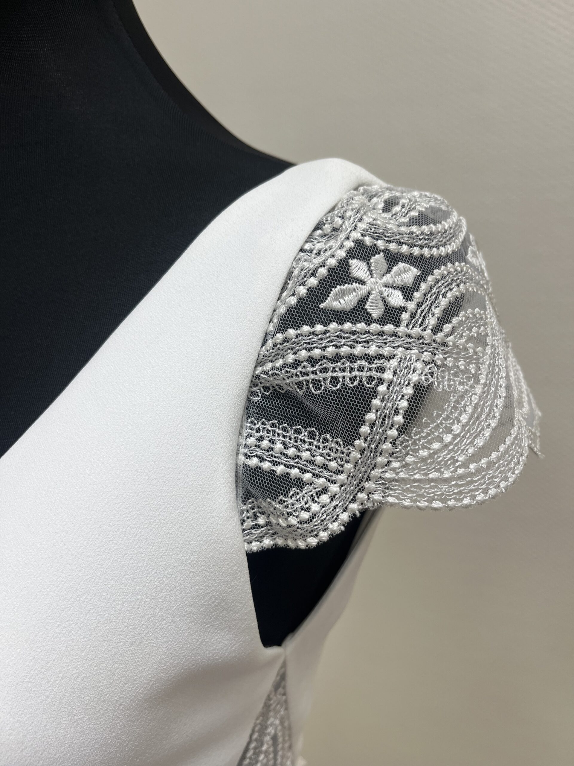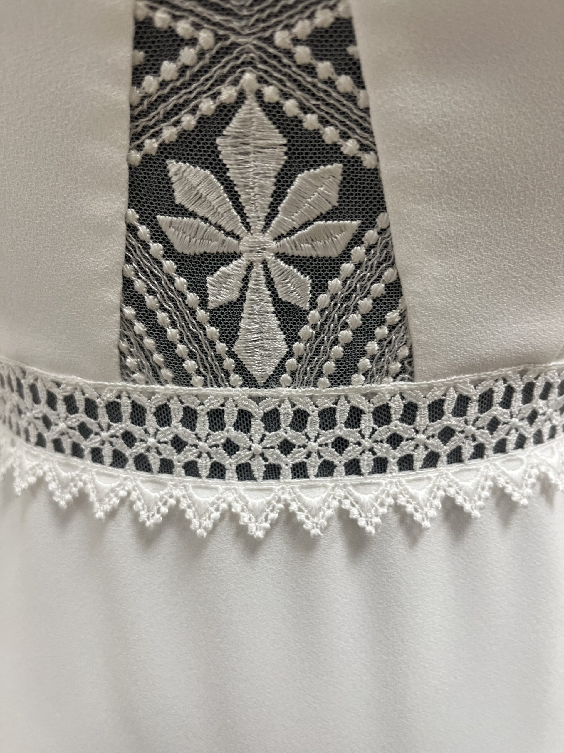 Le détail raffiné ? Une ceinture ajourée et géométrique en guipure, qui structure la silhouette en toute délicatesse. Des découpes transparentes au niveau de la taille et sous la poitrine créent un jeu de lumière tout en élégance, pour une allure à la fois chic et minimaliste.