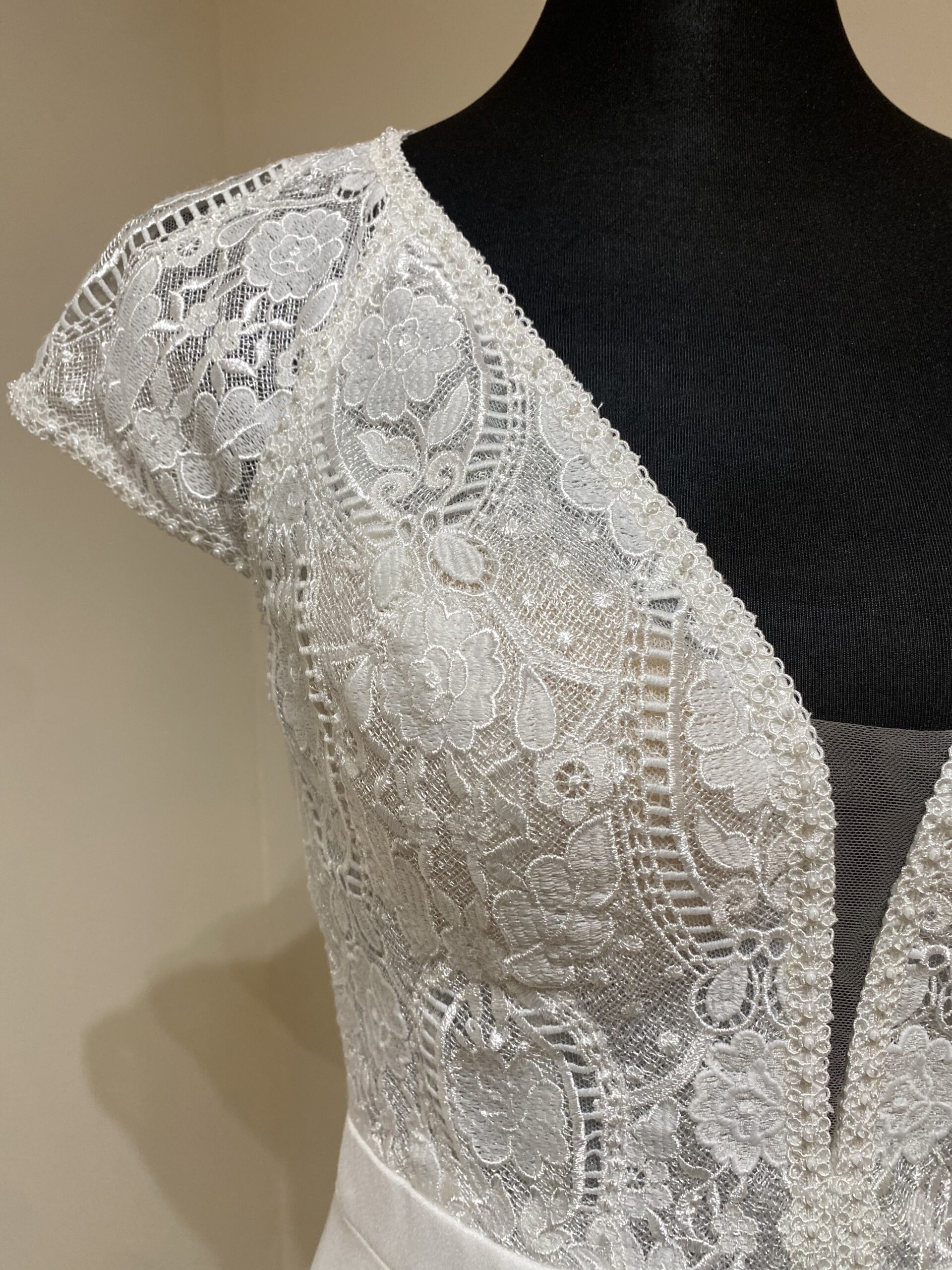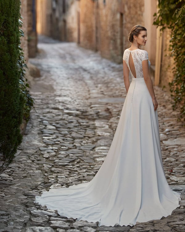 La robe de Mariée Umnia signée Rosa Clara, incarne parfaitement le style romantique et épuré. Son corsage en dentelle, orné d’un décolleté en V profond, sublime le buste avec grâce. De fines manches courtes transparentes en dentelle ajoutent une touche de douceur et de légèreté à l’ensemble.