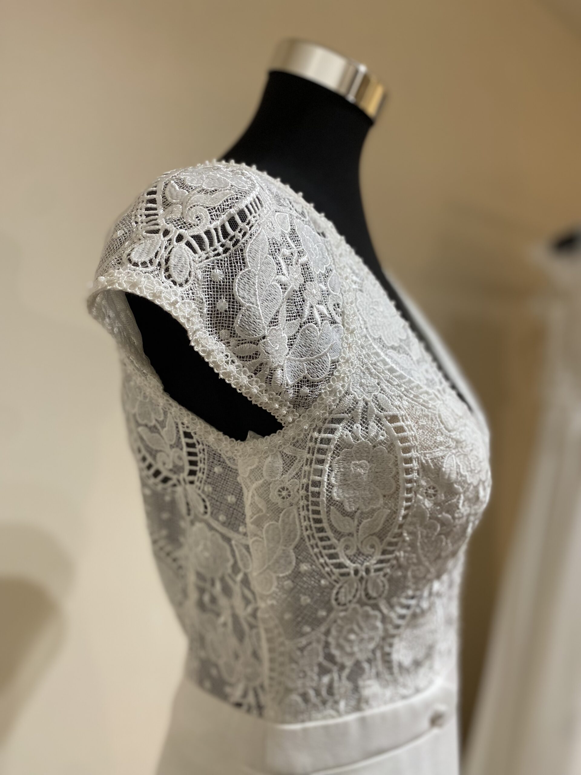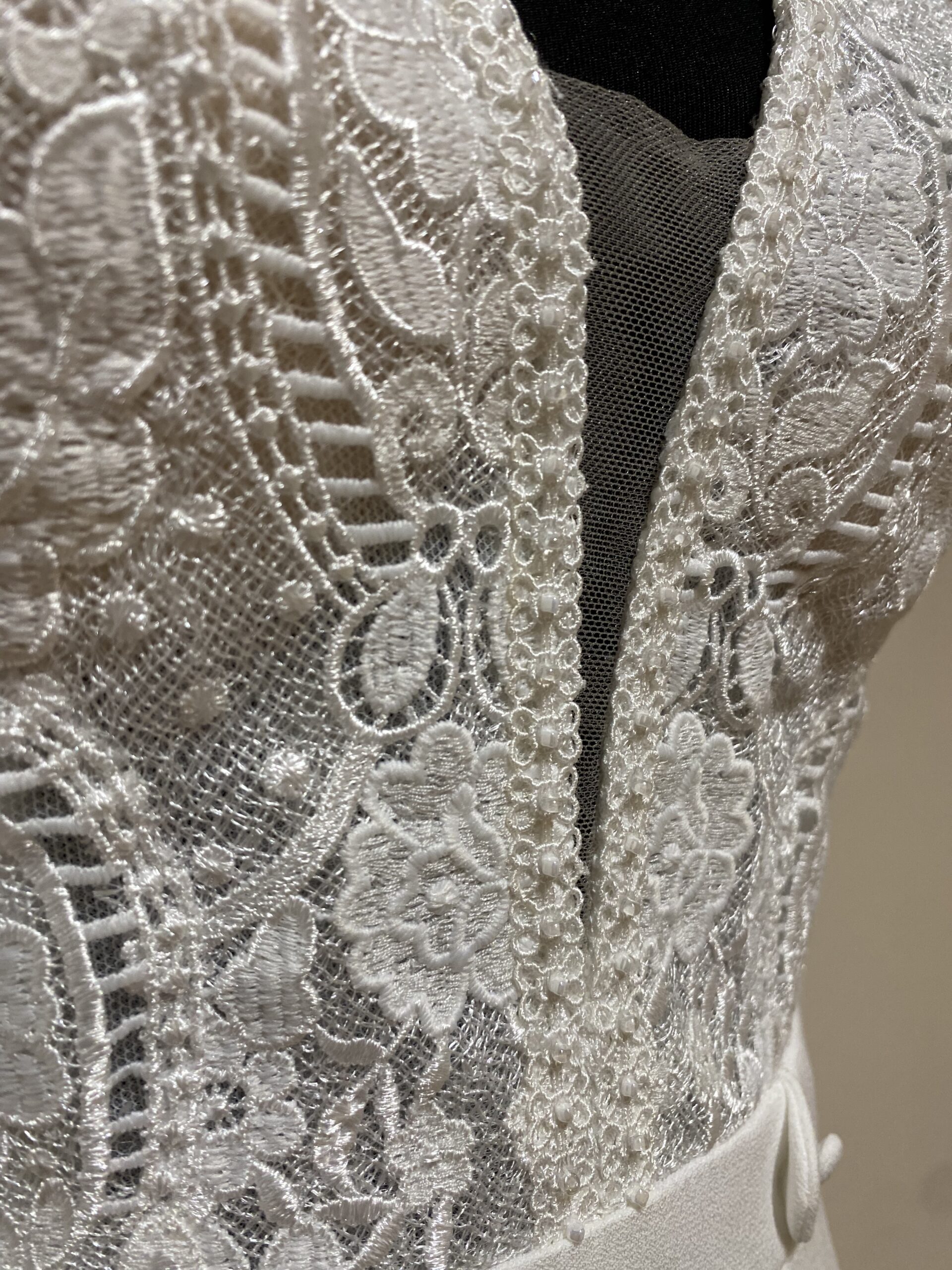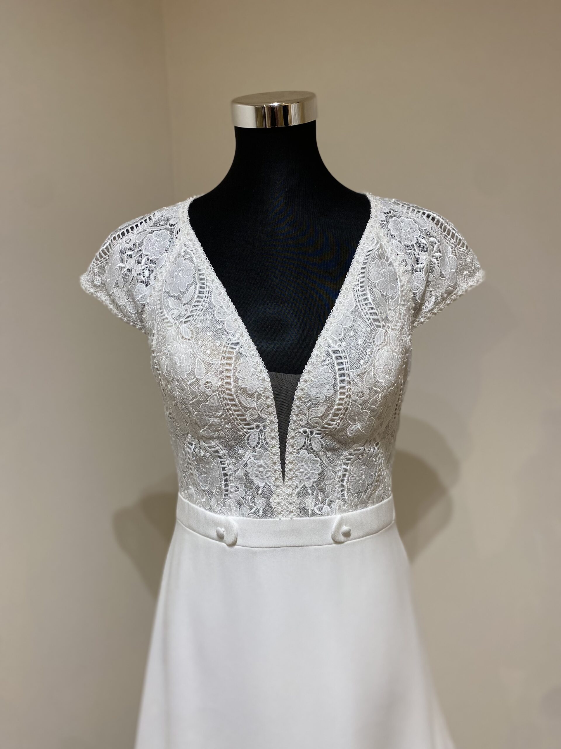 ✨ Détails : Robe coupe droite, décolleté en V profond, corsage en dentelle brodée, manches courtes en dentelle transparente, ceinture marquant la taille, jupe fluide en crêpe, dos en dentelle transparente avec décolleté goutte d’eau, fermeture par une rangée de boutons nacrés.