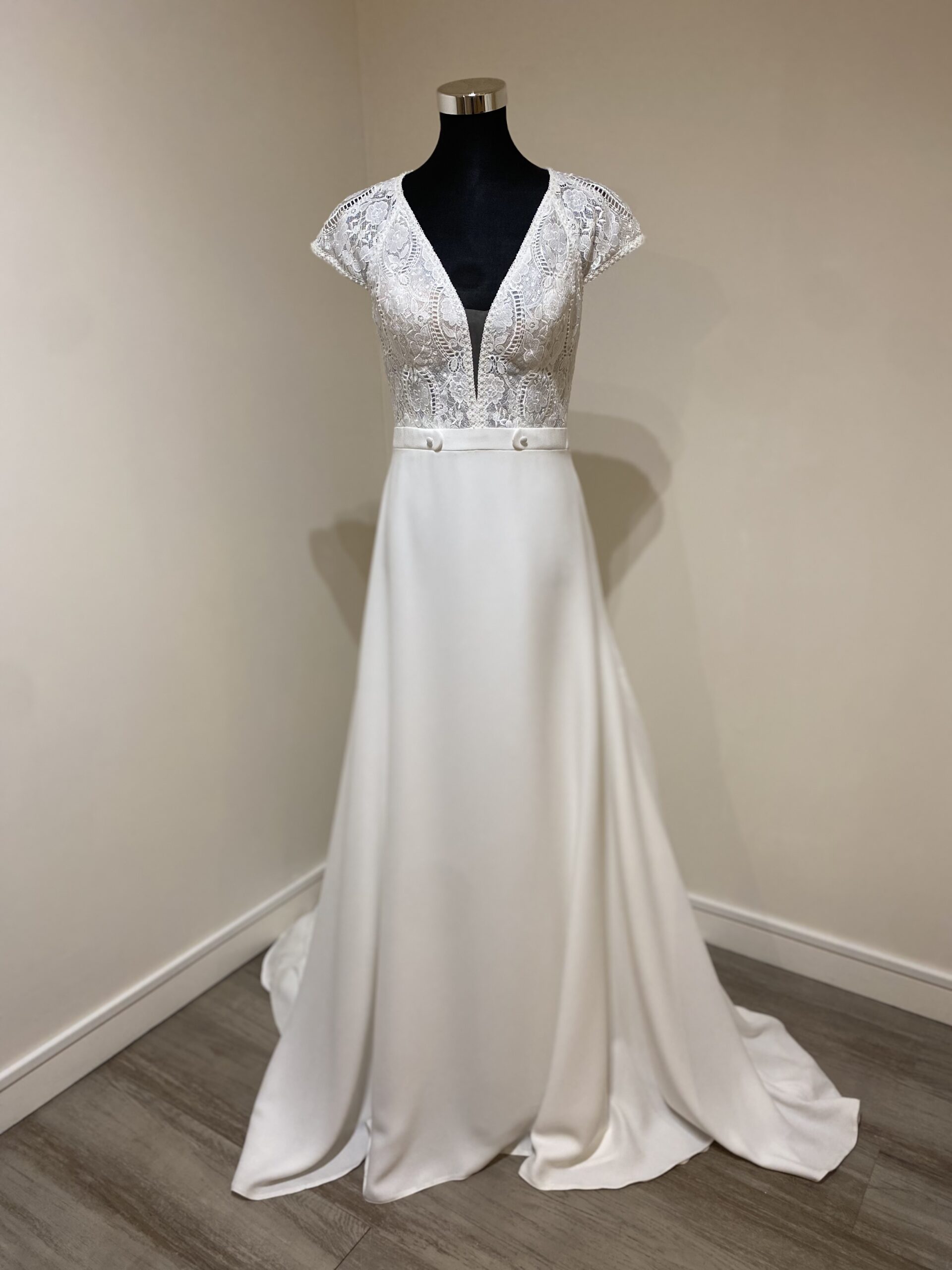 Un modèle tout en légèreté et féminité, parfait pour une mariée à la recherche d’un style à la fois romantique, moderne et intemporel.