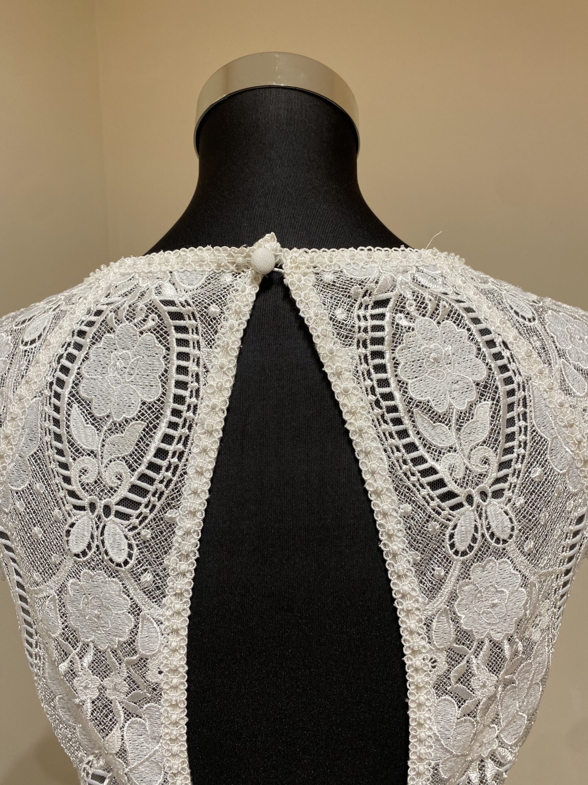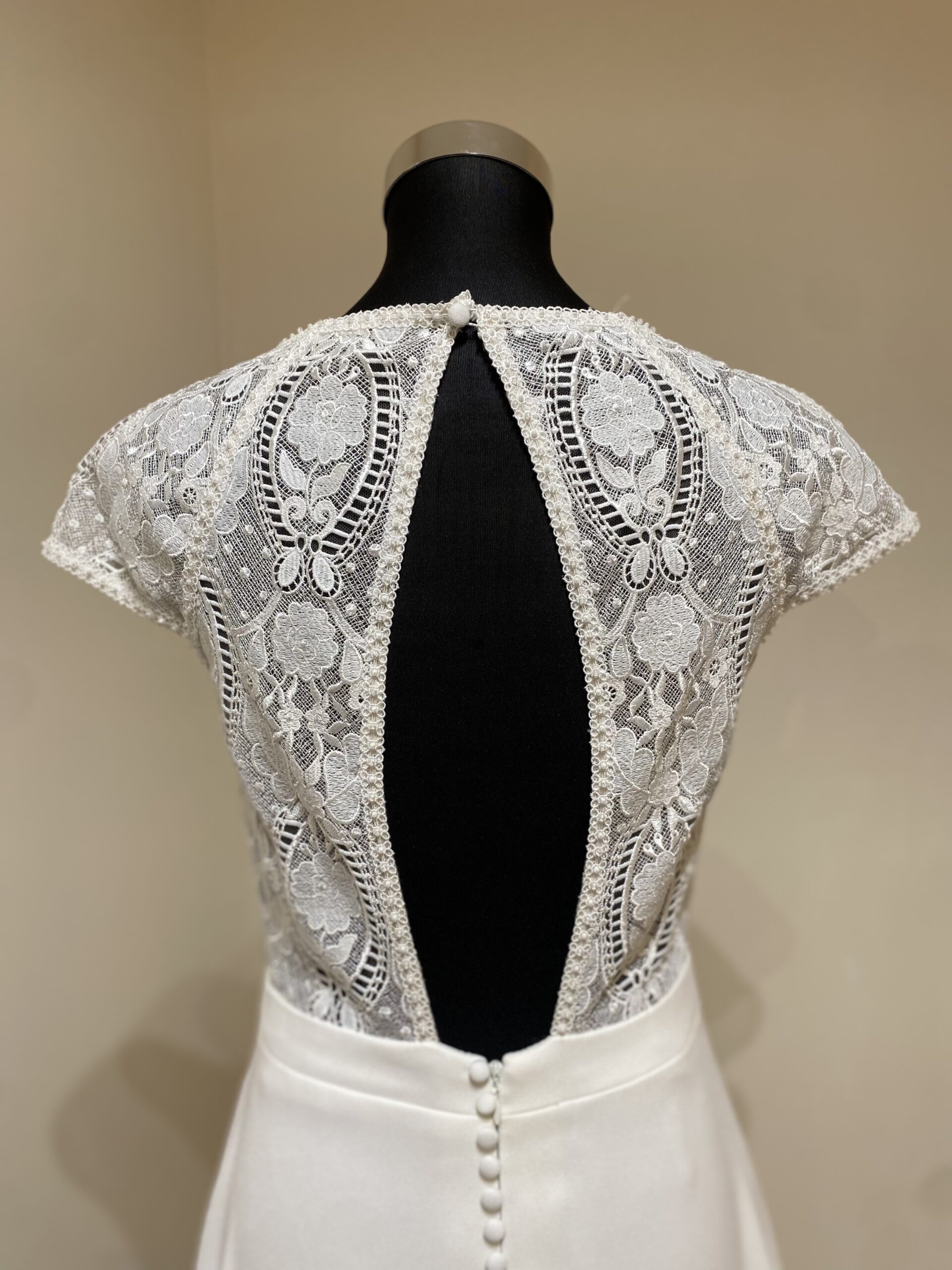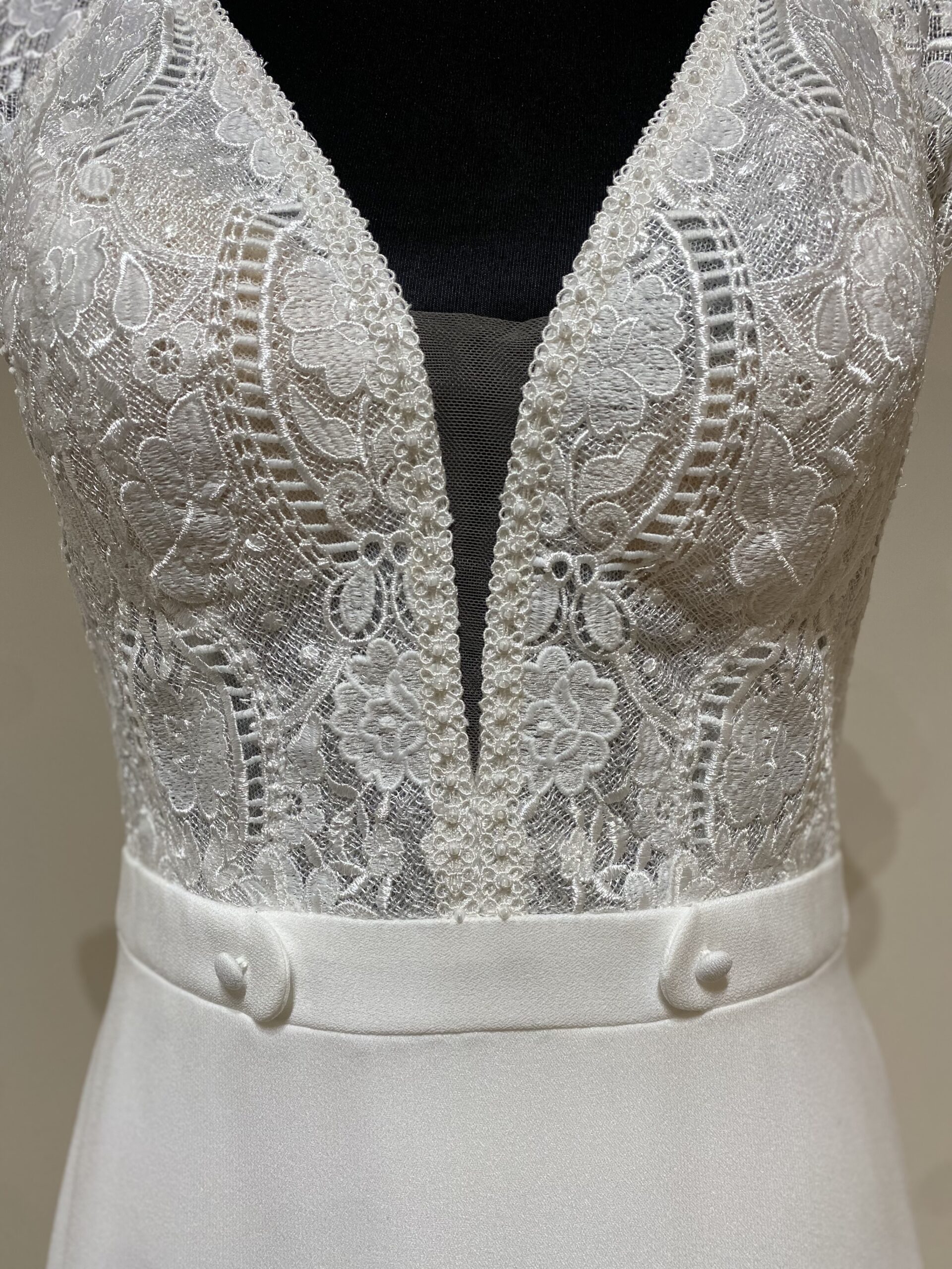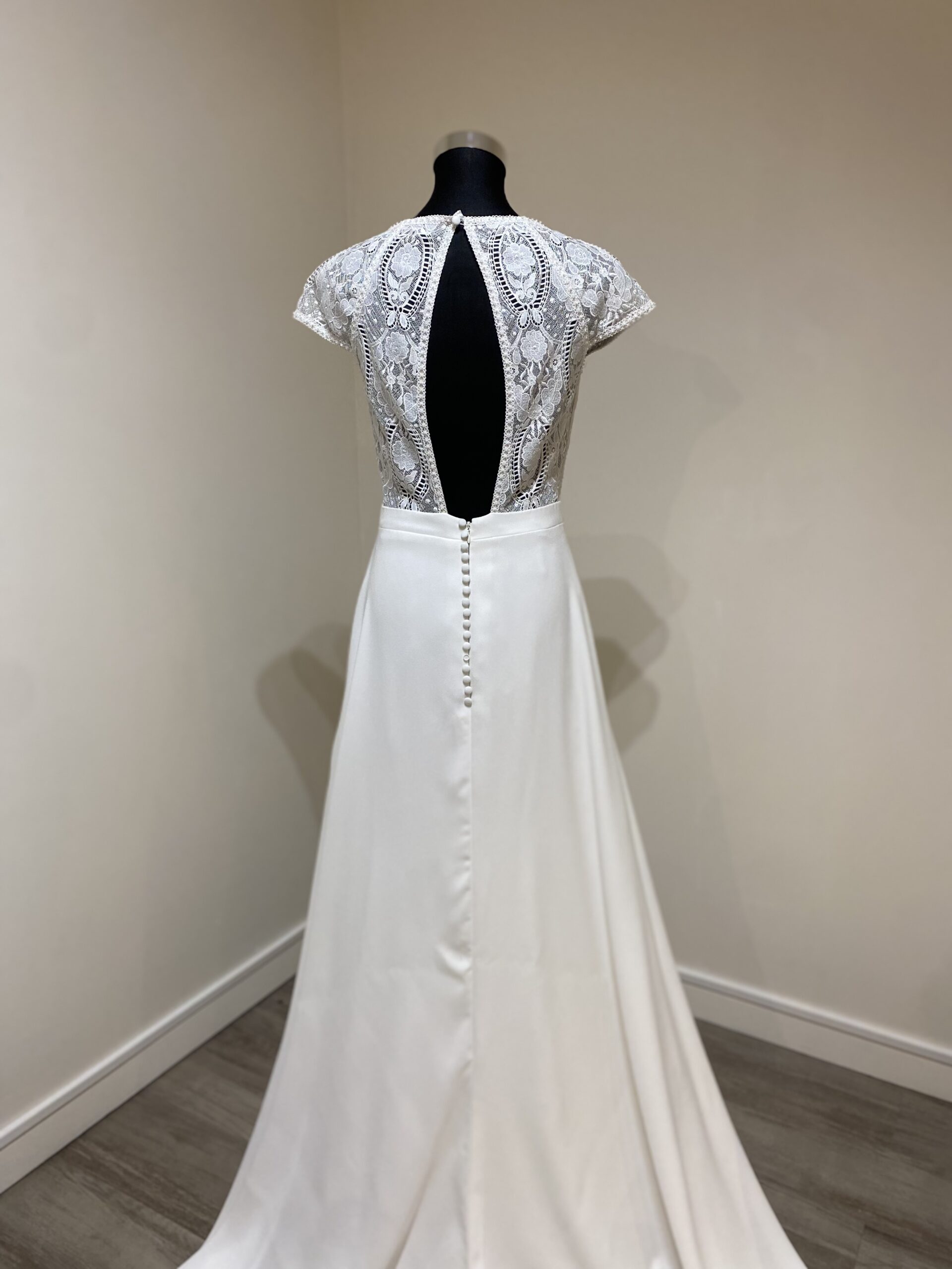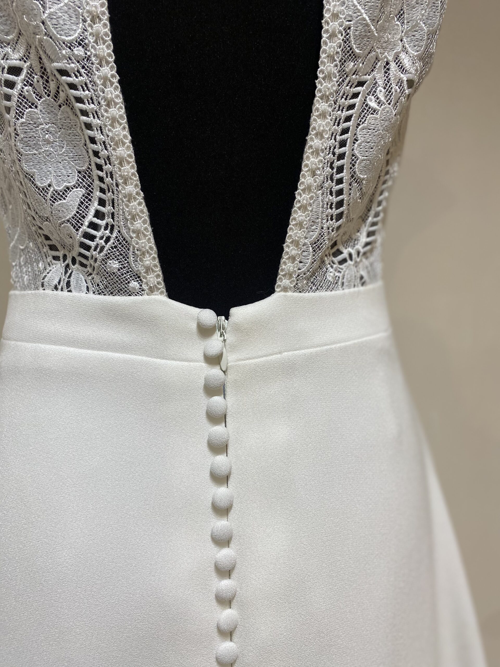 La taille est soulignée par une ceinture structurée, affinant la silhouette et mettant en valeur la ligne naturelle du corps. La jupe fluide en crêpe tombe avec élégance, tandis que le dos en dentelle transparente, délicatement ajouré d’un décolleté en goutte d’eau, apporte une touche de sensualité sophistiquée. Une rangée de boutons nacrés ponctue l’arrière de la robe, offrant une finition aussi discrète que raffinée.